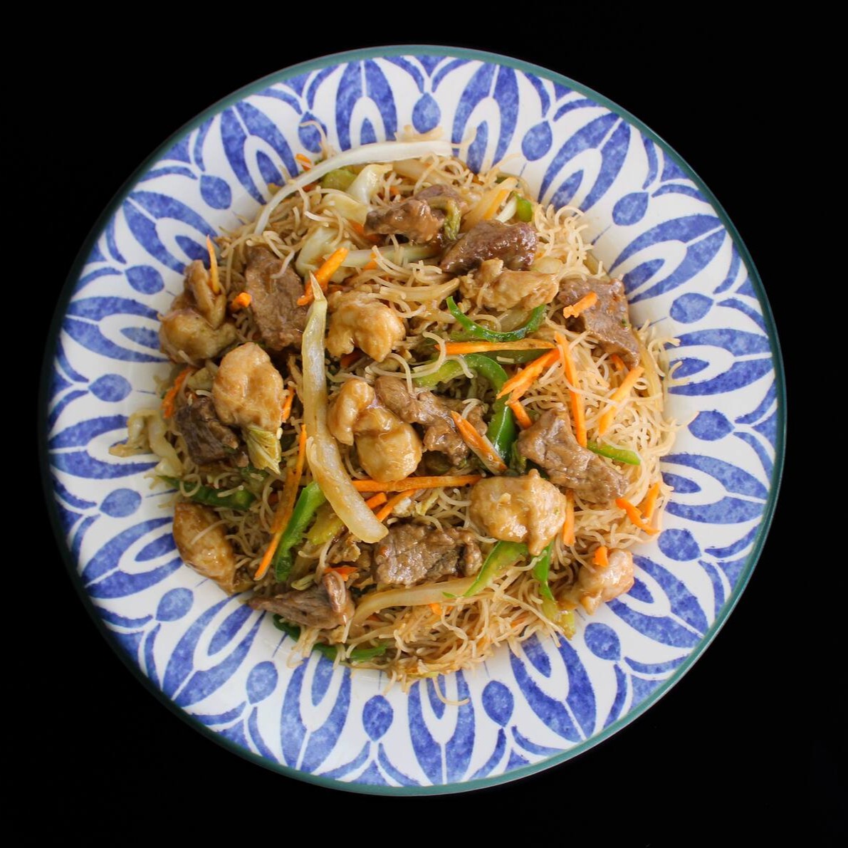 Macarrão de arroz com carne bovina, frango, broto de feijão, cenoura, ovos mexidos, cebola, salsão, pimentão e repolho, pode ser temperado com molho de soja ou molho curry.