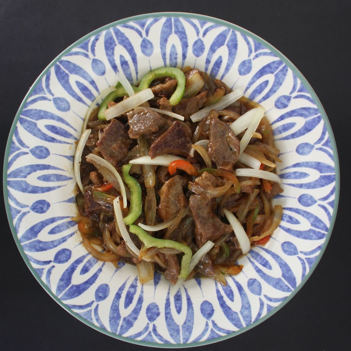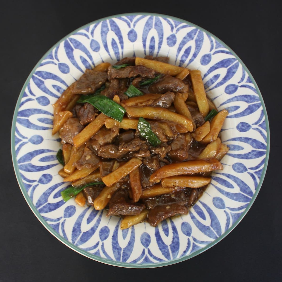 Carne em tiras com batatas fritas e refogadas ao molho de soja e cebolinha.