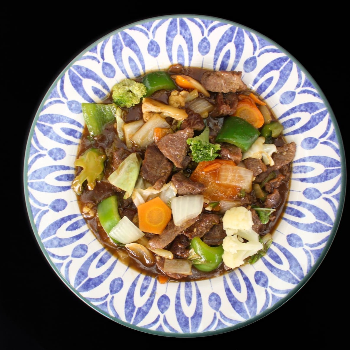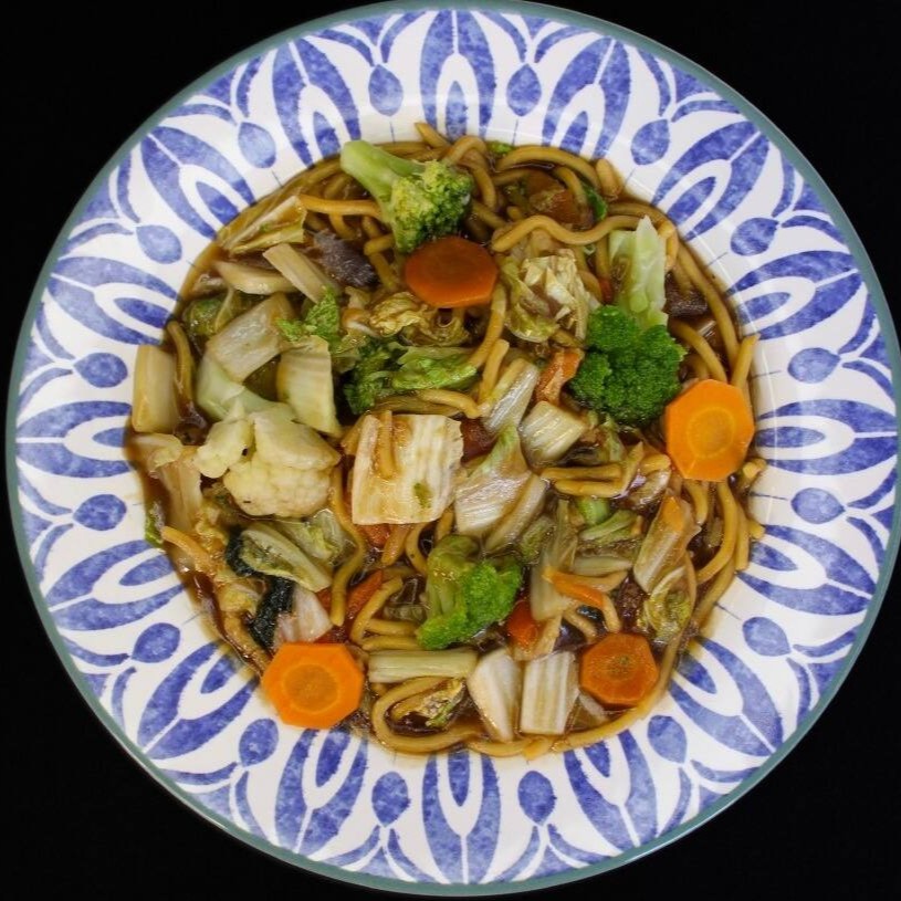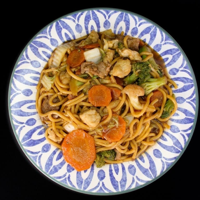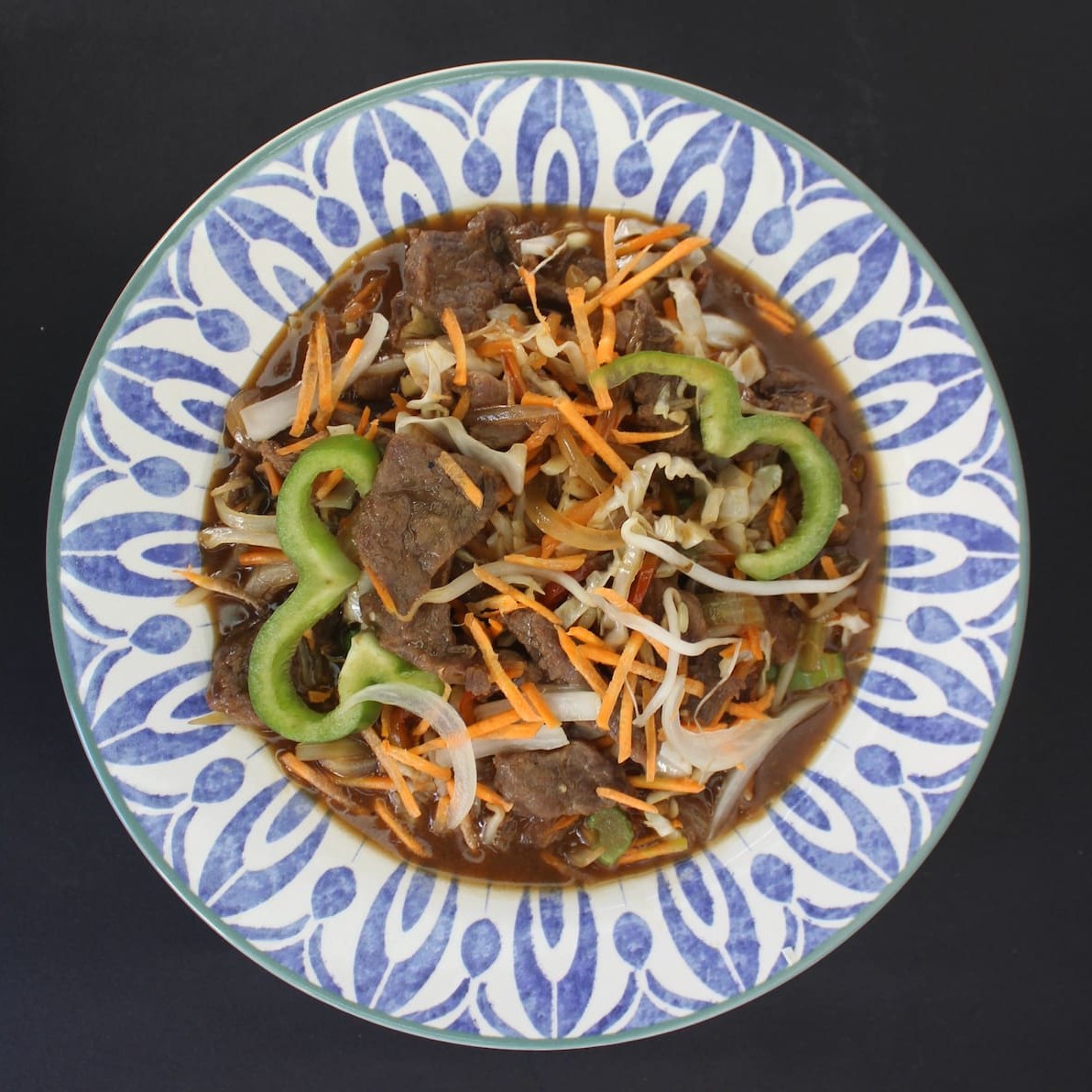 Macarrão típico chinês com carne bovina, cenoura, broto de feijão, cebola, pimentão e repolho, refogados com molho de soja.