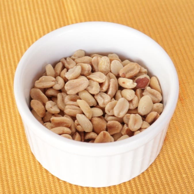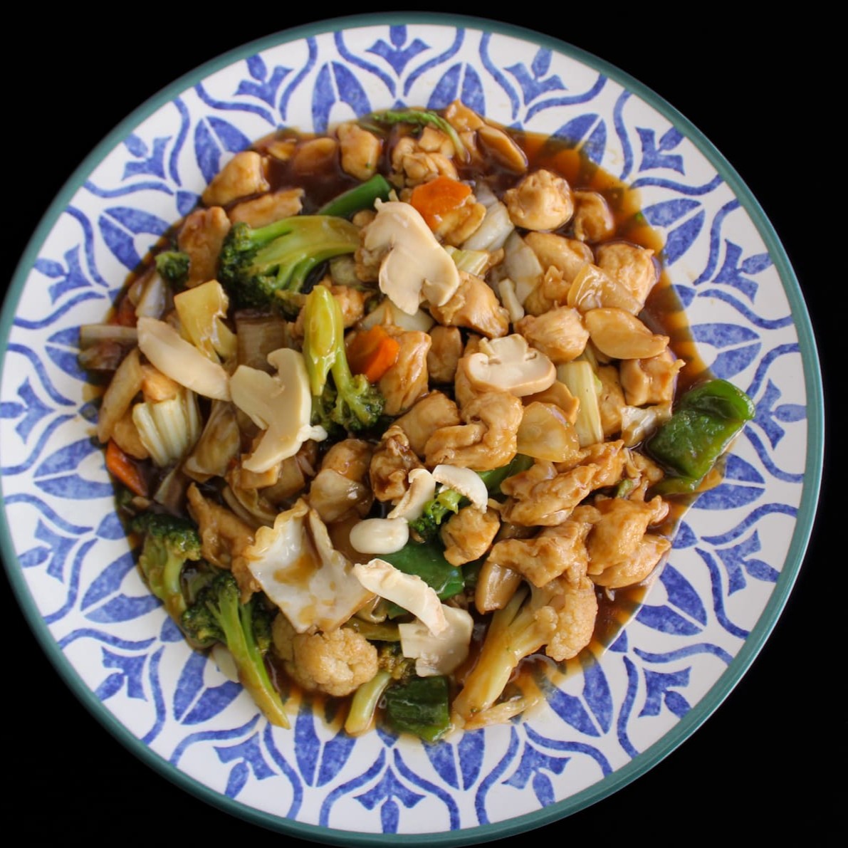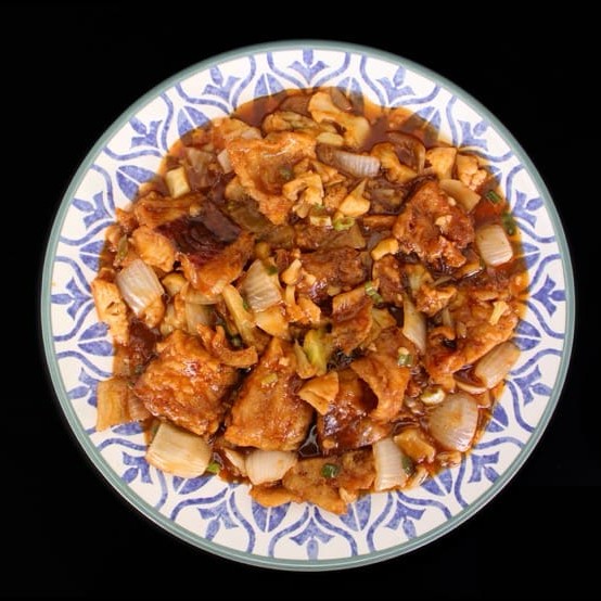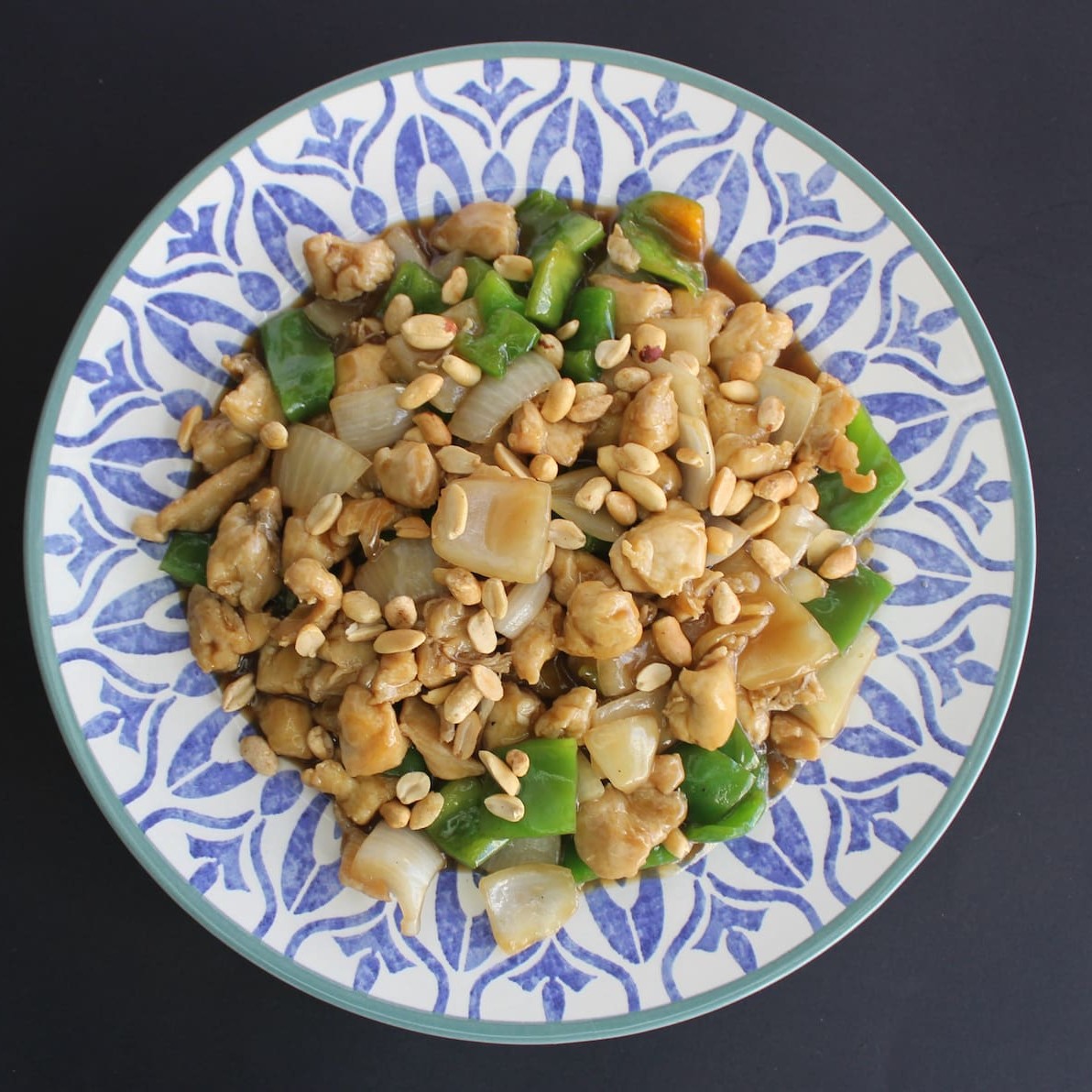 Tenros cubos de peito de frango com cebola, pimentão e amendoim.