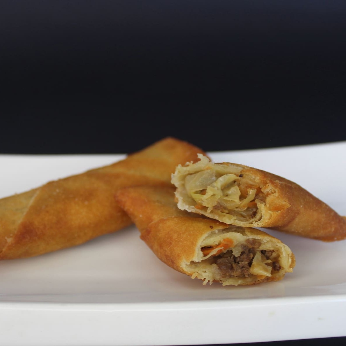 Massa leve e crocante, recheada com iscas de carne e legumes. Acompanha molho agridoce.