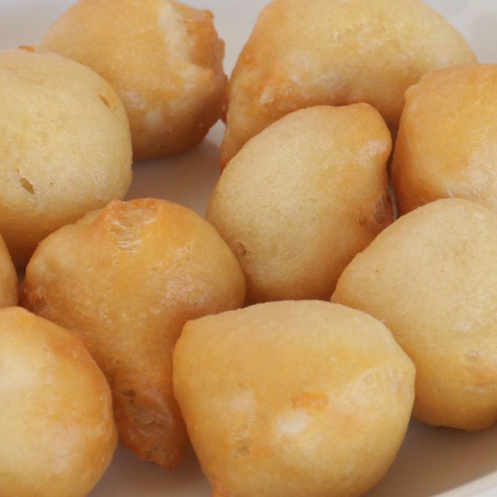 Cubos de lombos envolvidos em massa leve e sequinha, salpicada com cebolinha e alho.