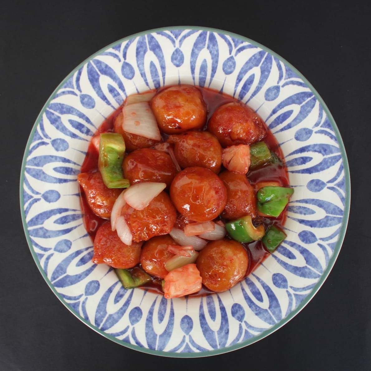Cubos de lombos envolvidos em massa leve e sequinha, refogado no molho agridoce, com pimentão, cebola e abacaxi.