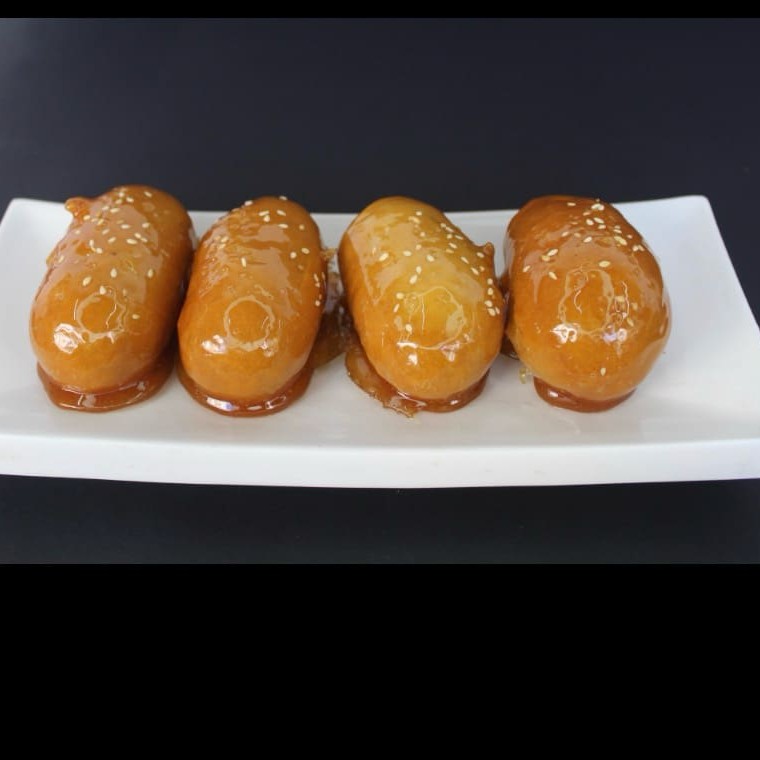 Banana envolvida em massa leve deliciosamente caramelada e salpicada com gergelim - 4 unidades.