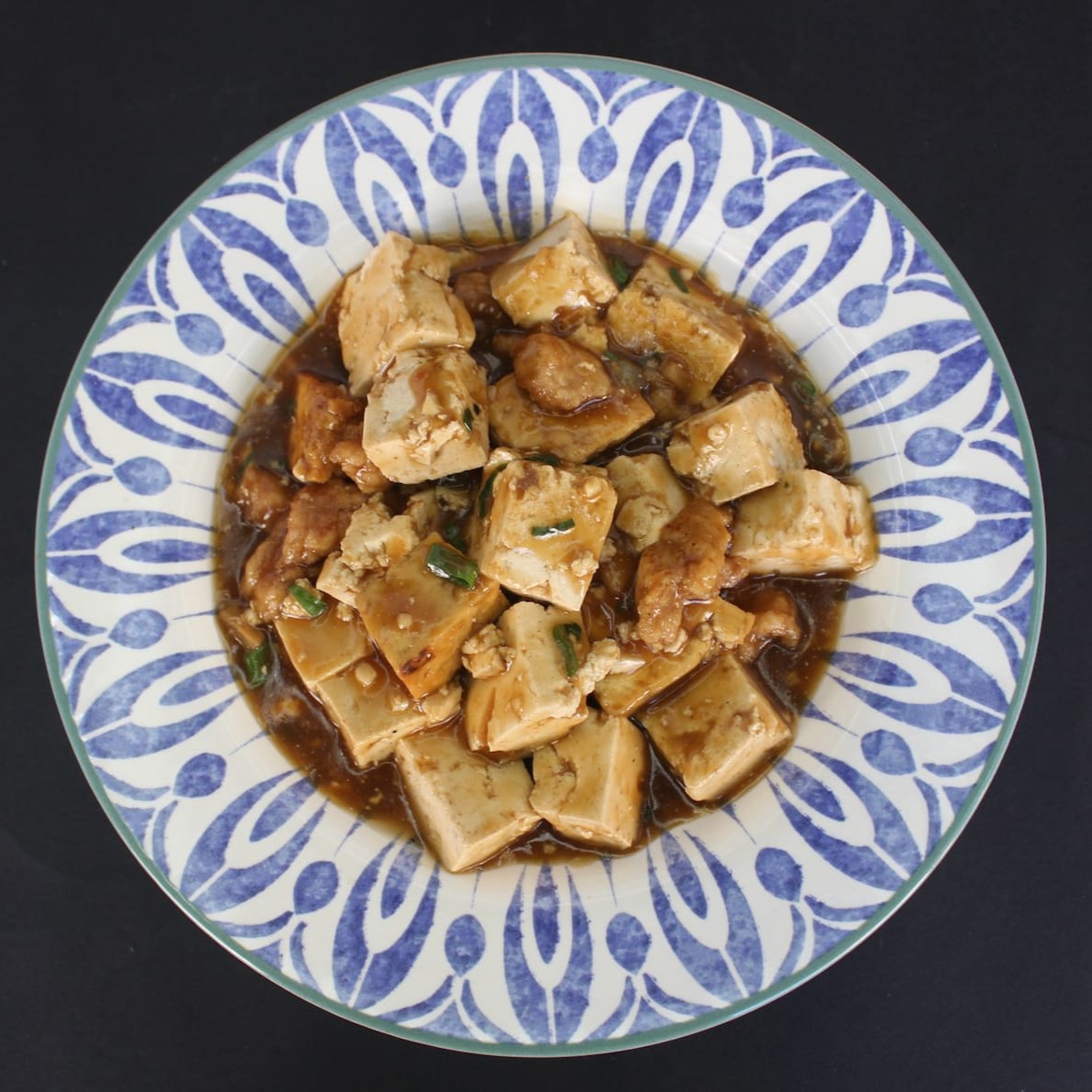 Tofu cortado em triângulos e frito com carne, frango e dez tipos de legumes selecionados, temperado ao molho de soja.