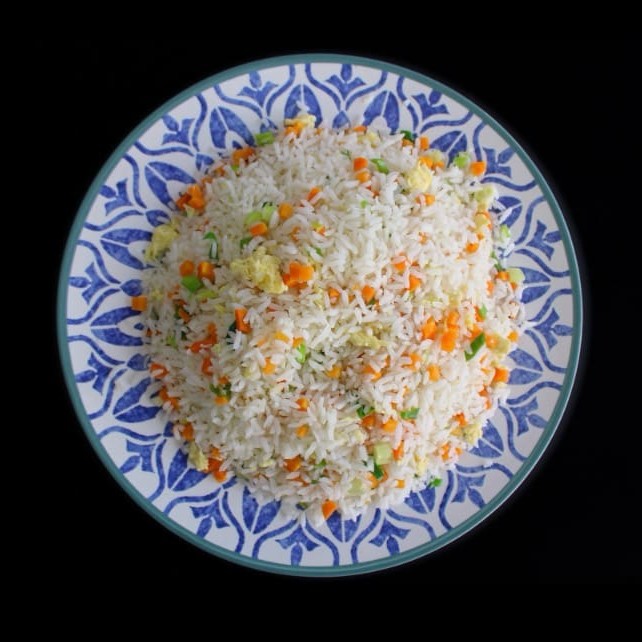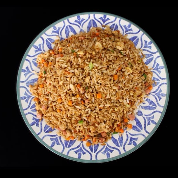 Tradicional risoto chinês com presunto, cebolinha, cenoura e ovos mexido.