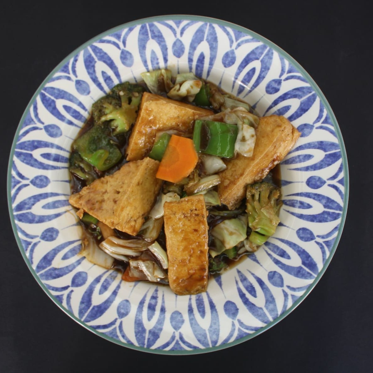 Tofu cortado em triângulos e frito com brócolis, cenoura, champignon, acelga, broto de bambu, salsão, couve flor, cebola, repolho e pimentão.