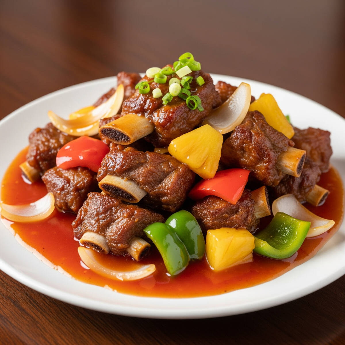 Costelinha frita e refogada no molho agridoce com cebola, pimentão e abacaxi.