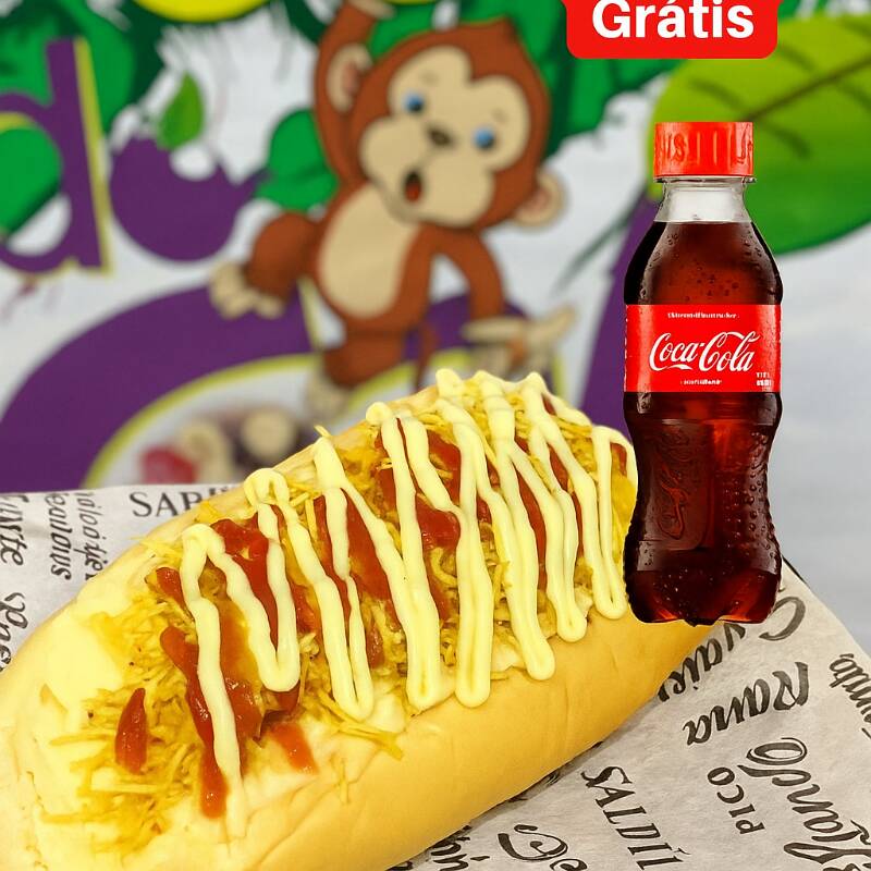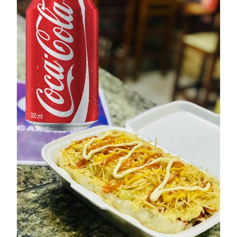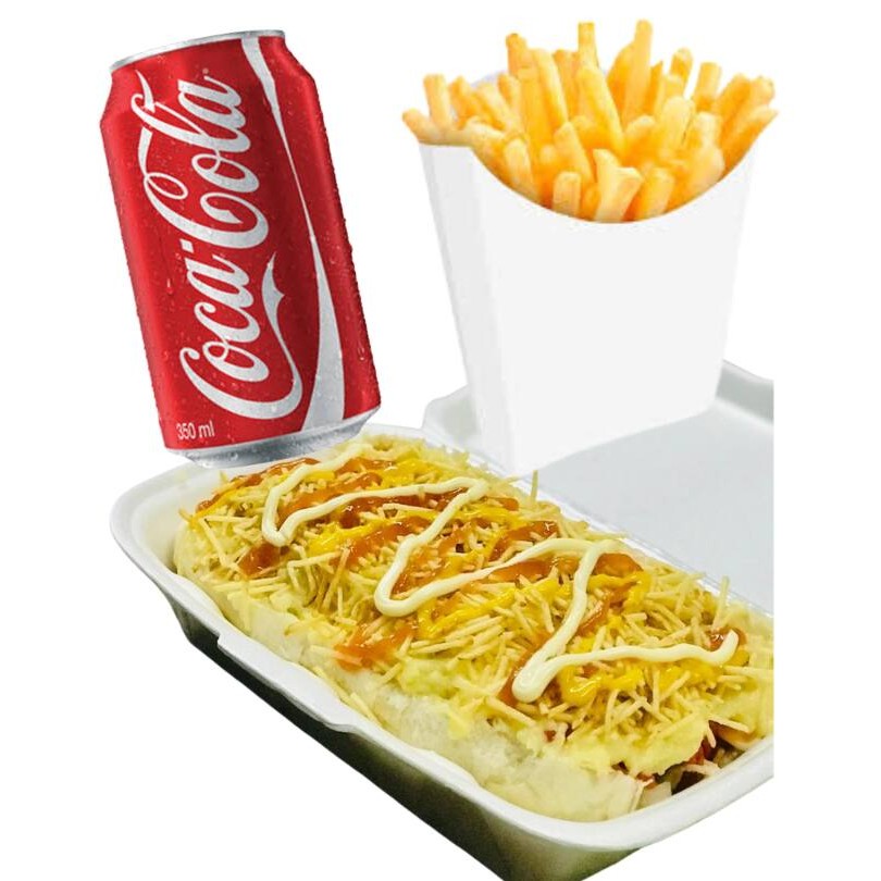 Hot-dog com uma salsicha no molho, acompanhado de um cremoso purê, milho, ervilha, vinagrete, maionese, ketchup e mostarda e para finalizar batata palha que traz uma textura irresistível. E para acompanhar 1 refrigerante lata 350ml.