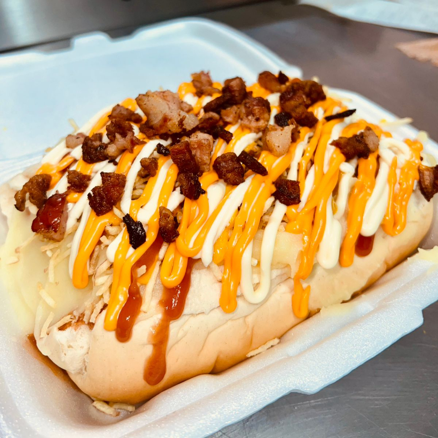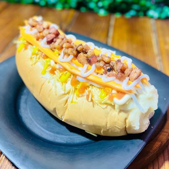 Delicioso hot-dog com uma salsicha suculenta no molho, acompanhado de um cremoso purê. Adicionamos milho, ervilha e vinagrete para trazer um toque de frescor. Para acompanhar, maionese, ketchup, mostarda, cheddar e o requeijão cremoso, garantindo uma explosão de sabores. E para finalizar adicionamos o bacon e a tão adorada batata palha, que traz a textura ideal ao prato. Desfrute de cada mordida!