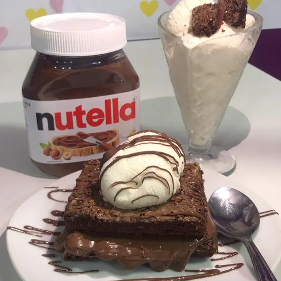 nosso sanduiche e preparado com brownie molhadinho , ganache de chocolate nobre, nuttela e finalizado com sorvete e chocolate nobre (usamos chocolate Garoto)