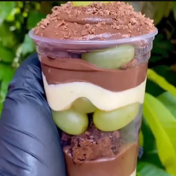 nosso copo da felicidade acompanha uvas verdes sem semente.creme de ninho, brownie e chocolate nobre..250 ml