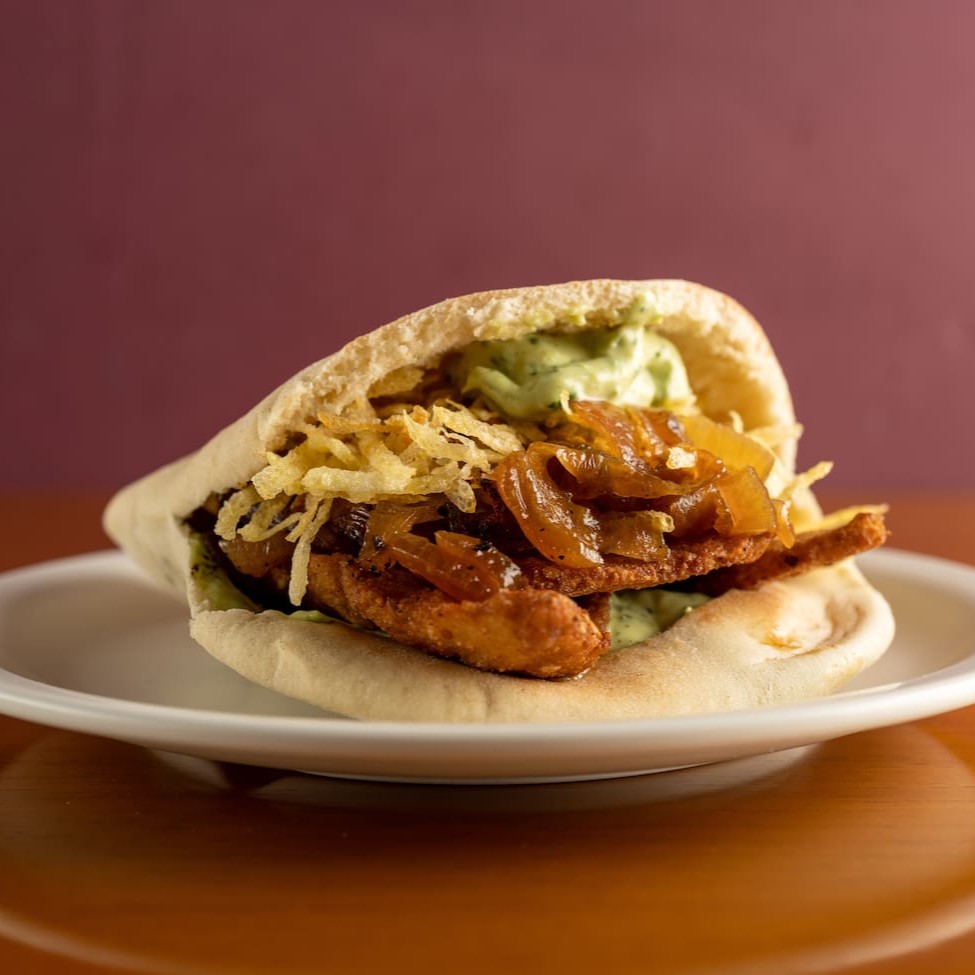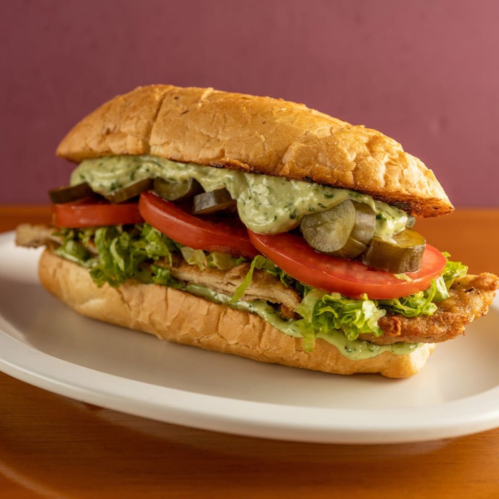 Bife empanado crocante, maionese de zaatar, picles de pepino, cebola tostada e tomate, servido na baguete.