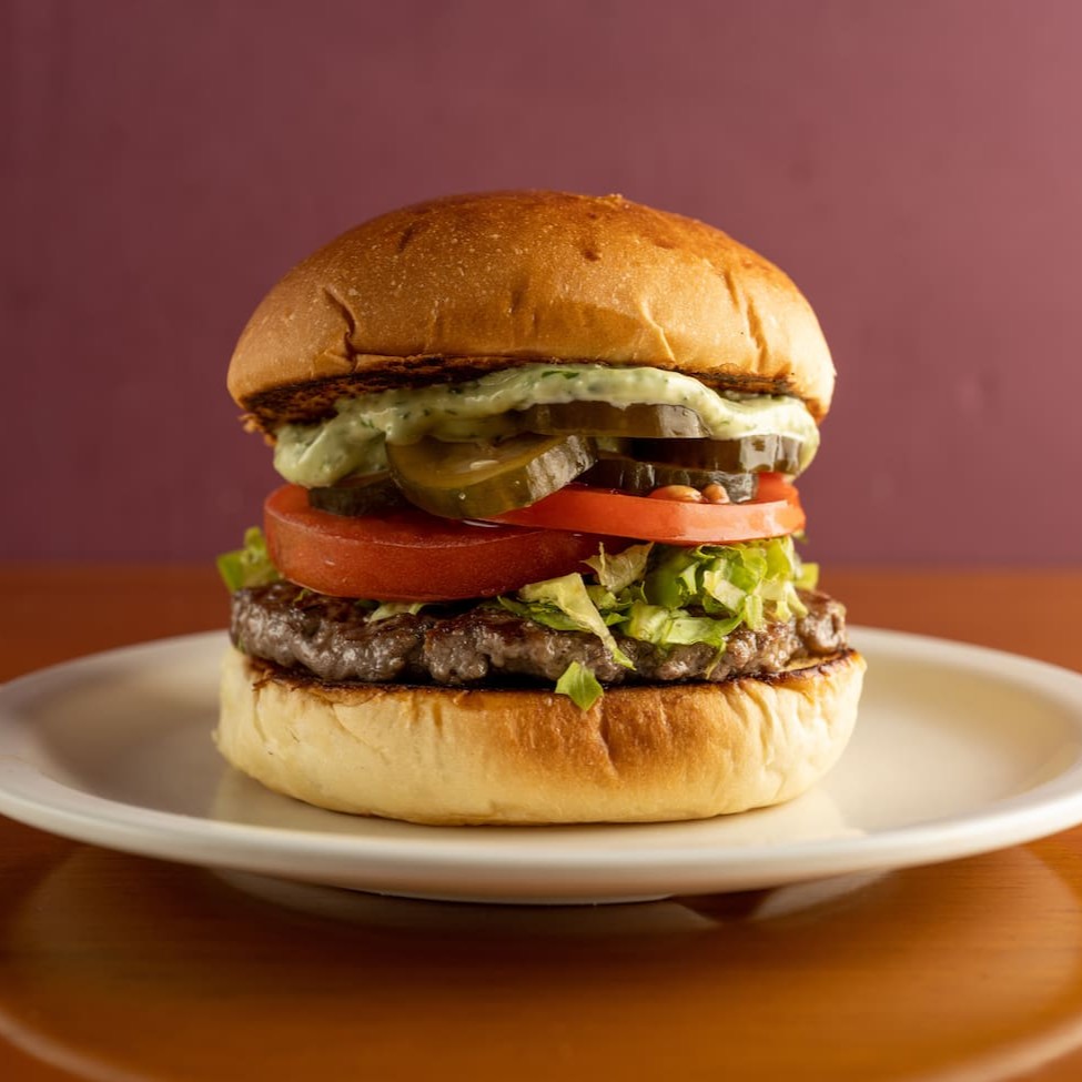 Burger, alface, tomate, picles de pepino e maionese Pinati.