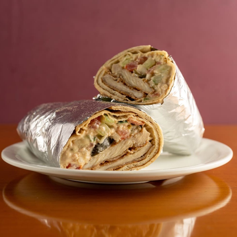 Filé de frango grelhado, bacon bovino, alface, tomate e maionese de mostarda.