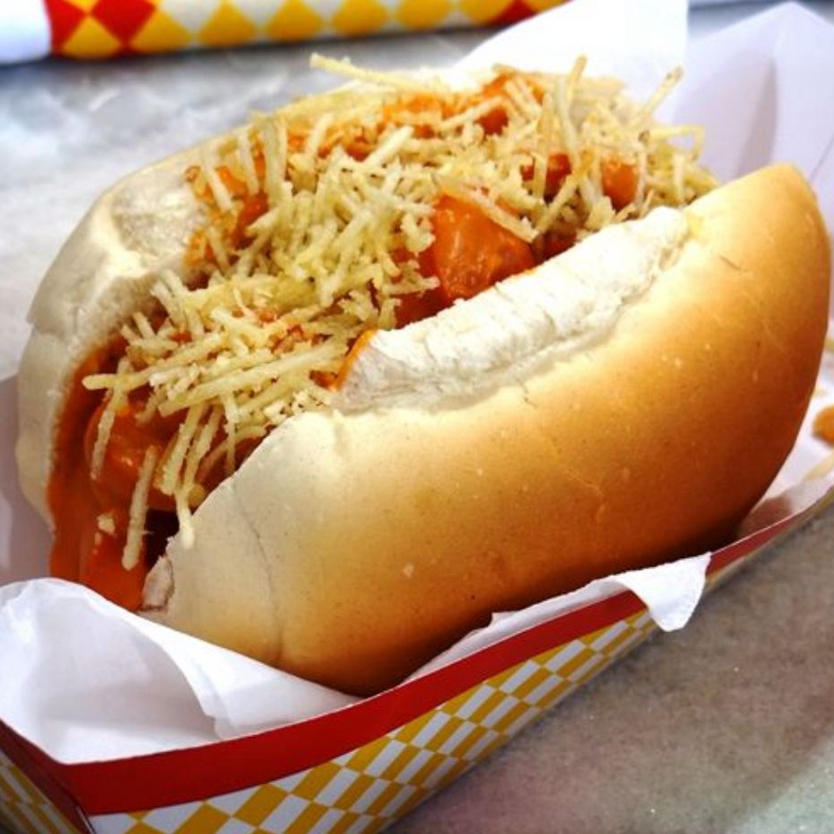 Pão, salsicha, maionese, purê, batata palha. molhos