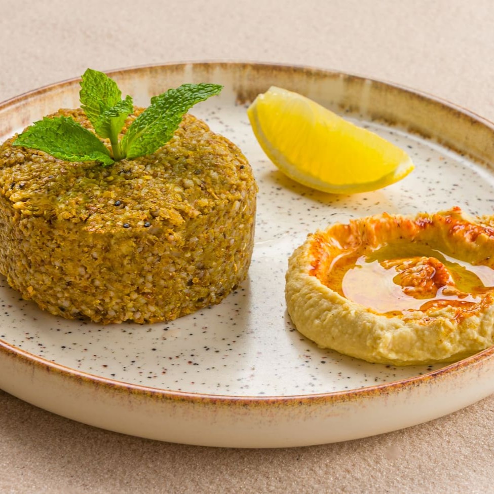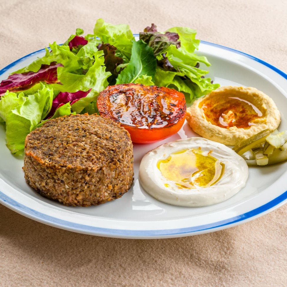 Delicioso quibe assado, suculento e recheado de sabores, servido com um mix de folhas. Realça-se o sabor com tomate assado, o prato ainda apresenta picles, juntamente com homos . Para completar, oferecemos torradas crocantes e o pão Pita da casa.
