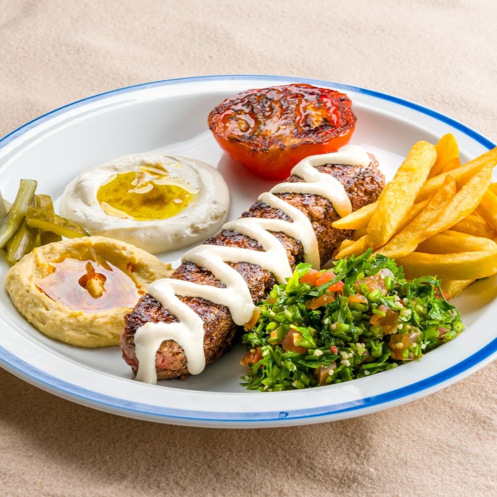 Acompanha pão folha, Kafta 130g (in natura), tabule, fritas, coalhada seca e pasta de alho. Acompanha pasta de alho