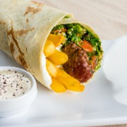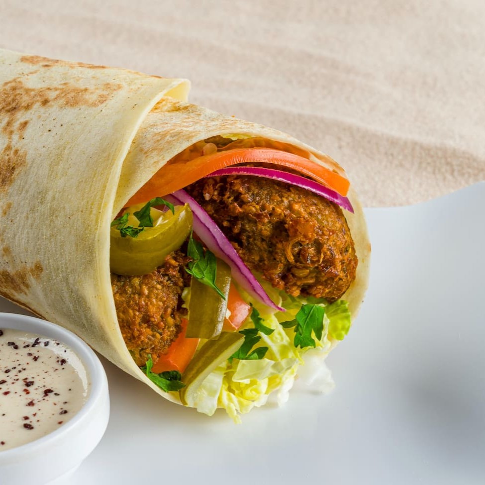 Este kebab é composto por três suculentos bolinhos de falafel. Enrolados em um leve pão folha, juntamente com acelga, tomate, salsinha fresca e cebola roxa. Para aprimorar ainda mais o sabor, adicionamos picles e um generoso fio do nosso autêntico molho de tahine.
