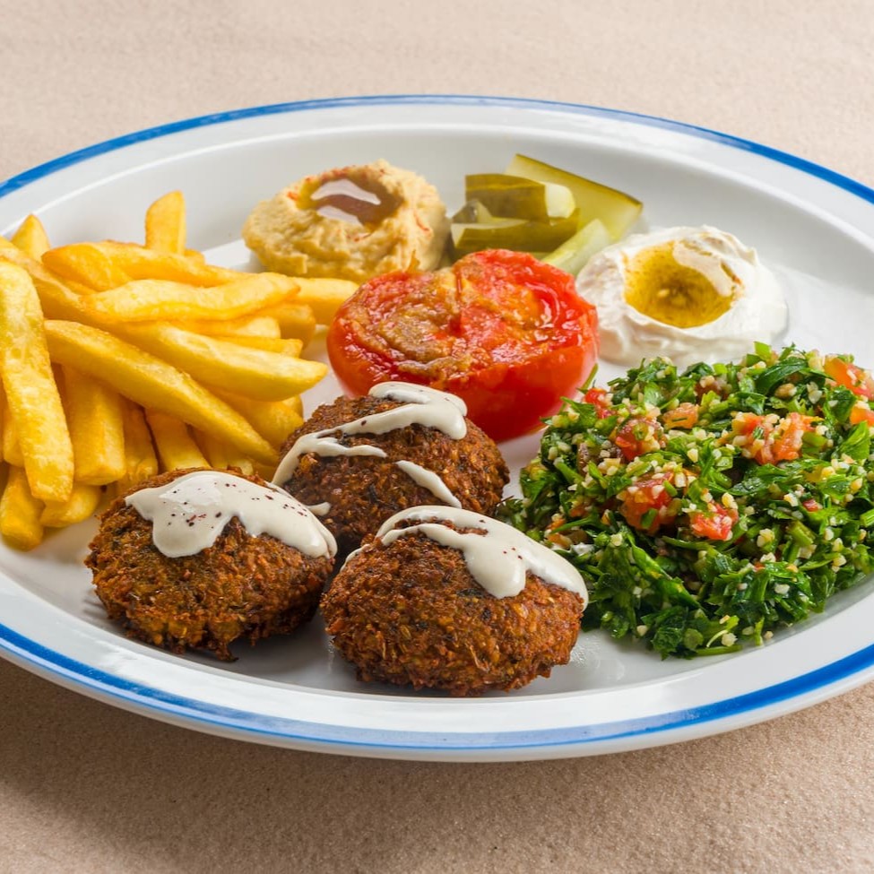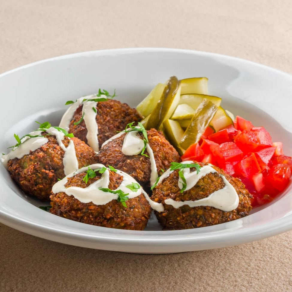 Delicie-se com três irresistíveis bolinhos de falafel, que encantam pelo exterior crocante e interior macio. Eles vêm acompanhados de um mix de folhas frescas, tomate assado, picles. Tudo isso servido com torradas crocantes e o pão Pita da casa.