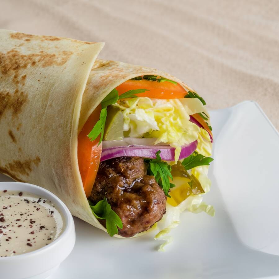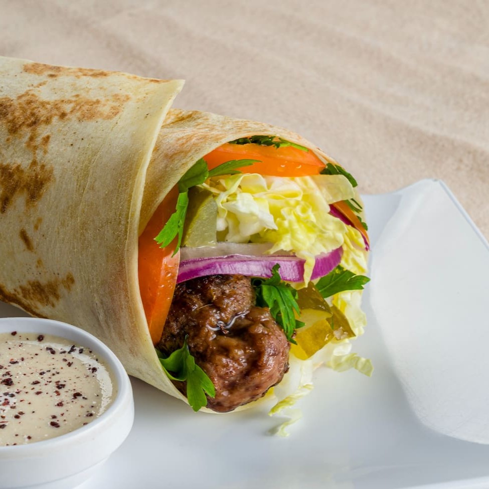 Apresentamos o nosso Kebab Kafta! Este magnífico é composto por uma Kafta de 130g (in natura), intensamente saborosa e suculenta. Acompanha um molho de tahine cremoso, o toque é garantido pelo picles, acelga, tomate, salsinha e a cebola roxa, frescos e cuidadosamente selecionados. Tudo isso é enrolado em um pão folha leve e macio. Uma experiência culinária imperdível!