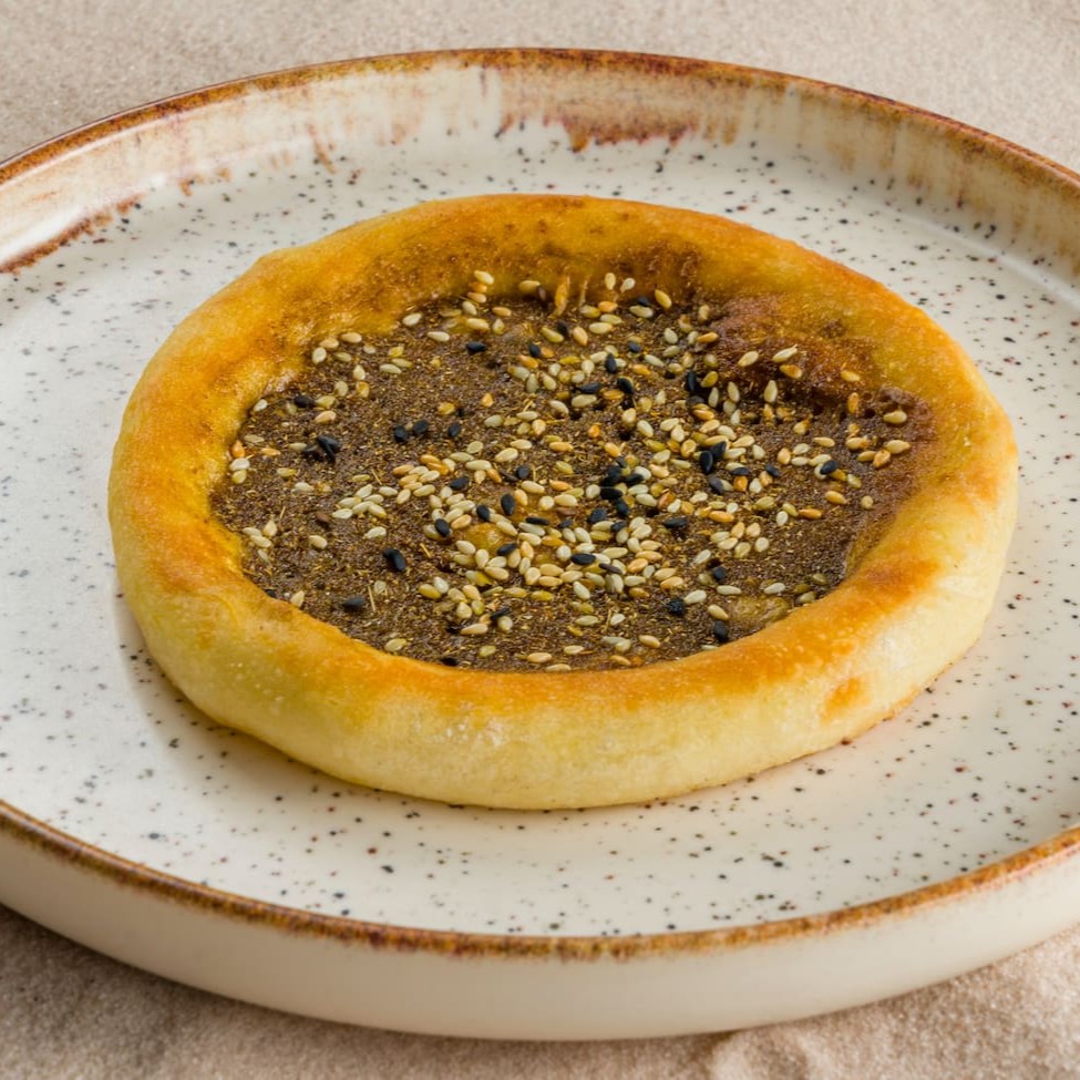 Deliciosa esfiha aberta de zaatar, feita com uma massa fina e macia. A receita é aprimorada com a adição de azeite, que traz um sabor e uma textura. O toque final fica por conta do zaatar, cada mordida levará você a uma viagem culinária inesquecível.