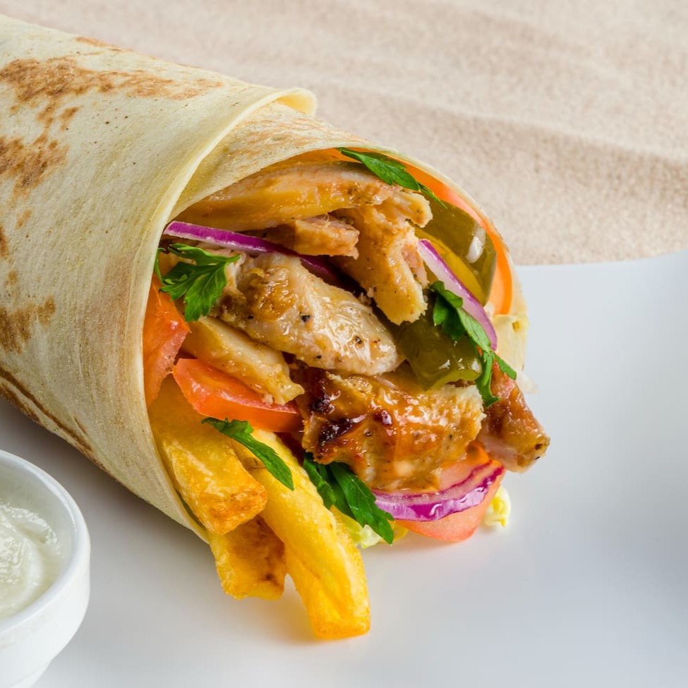 Delicioso Kebab de frango, preparado com suculentas lascas de frango, marinada em especiarias e pasta de alho. Acompanha pasta de alhoEste kebab é enriquecido com o sabor de picles, acelga, tomate, e salsinha, a textura perfeita de batatas fritas e o toque final da cebola roxa. Para completar, acompanha uma pasta de alho cremosa, perfeitamente temperada. Uma verdadeira explosão de sabores que surpreende a cada mordida!