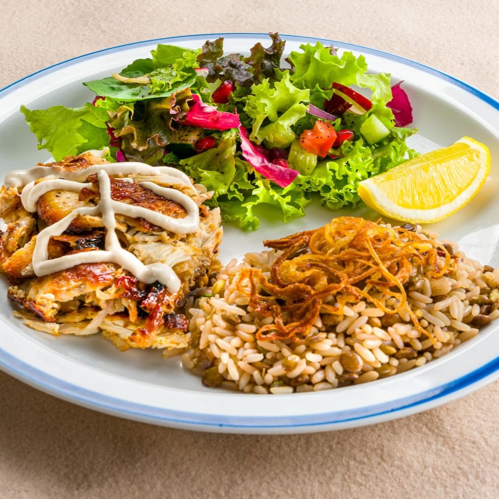 Acompanha frango, arroz com lentilha e a deliciosa saladinha fatouch ! Para acompanhar, torradinhas e Pão Pita da casa .