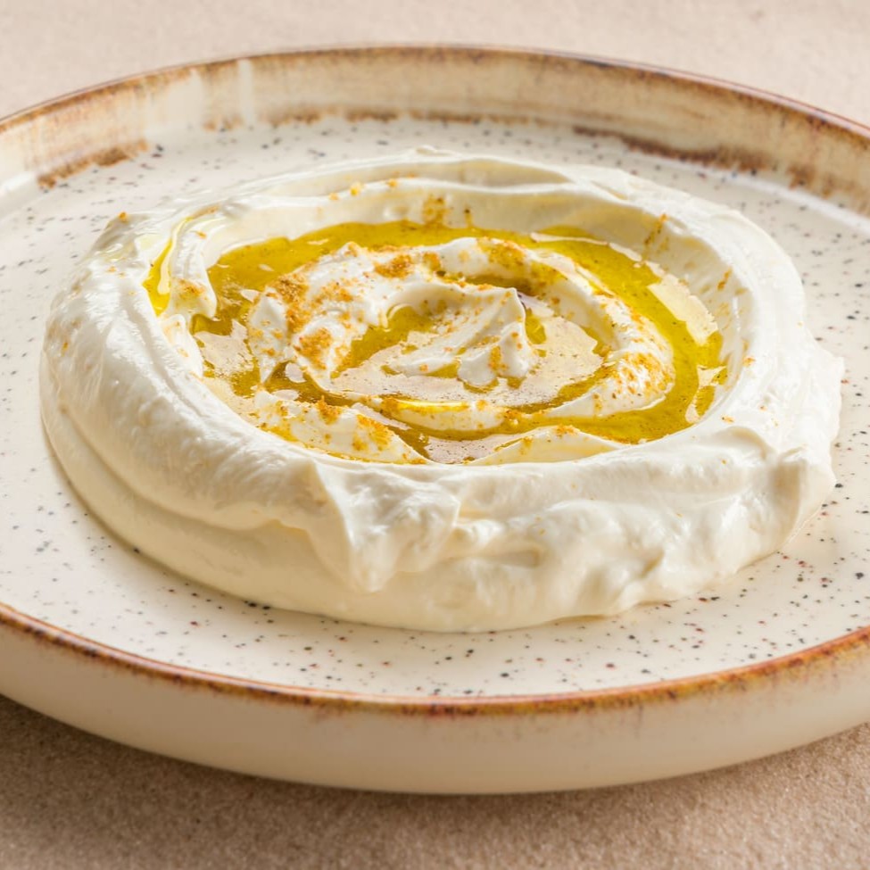 O nosso trio acompanha coalhada seca, homos e baba ghanoush. Cada pasta tem 100g .