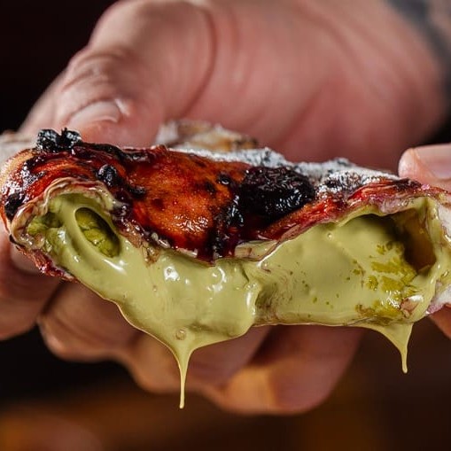 Delicioso rolinho feito com a nossa massa de pizza de longa fermentação, recheado com queijo brie e de acompanhamento, mel