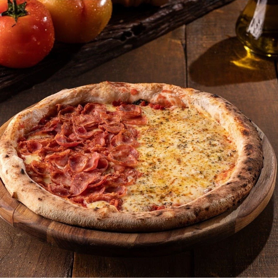 Pizza 1/2 Castelões + 1/2 Pizza Mozzarella - 8 Pedaços A combinação de 2 sabores dos nossos mais vendidos, uma ótima escolha para quem ama sabores tradicionais.