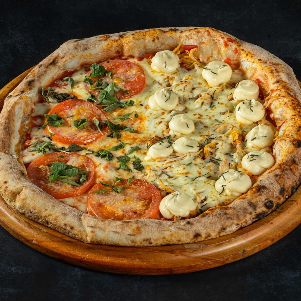 Pizza 1/2 Frango com Catupiry + 1/2 Pizza Margherita - 8 Pedaços A combinação de 2 sabores dos nossos mais vendidos, uma ótima escolha para quem ama sabores tradicionais.