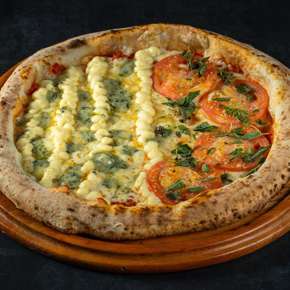 Pizza 1/2 Quatro Queijos + 1/2 Pizza Margherita - 8 Pedaços A combinação de 2 sabores dos nossos mais vendidos, uma ótima escolha para quem ama sabores tradicionais.