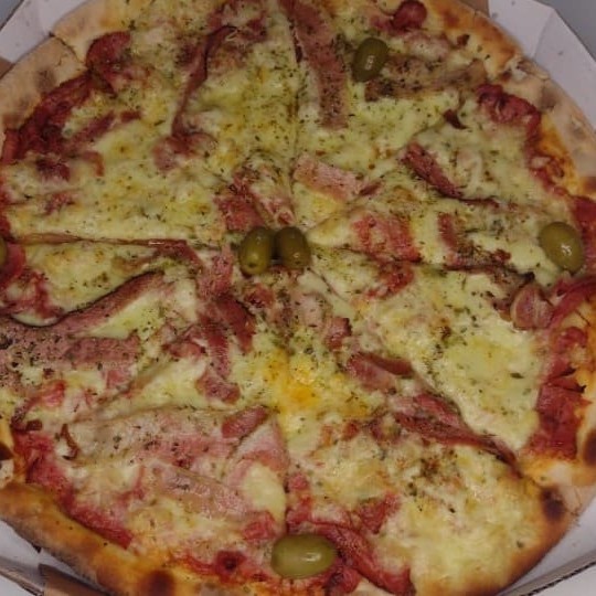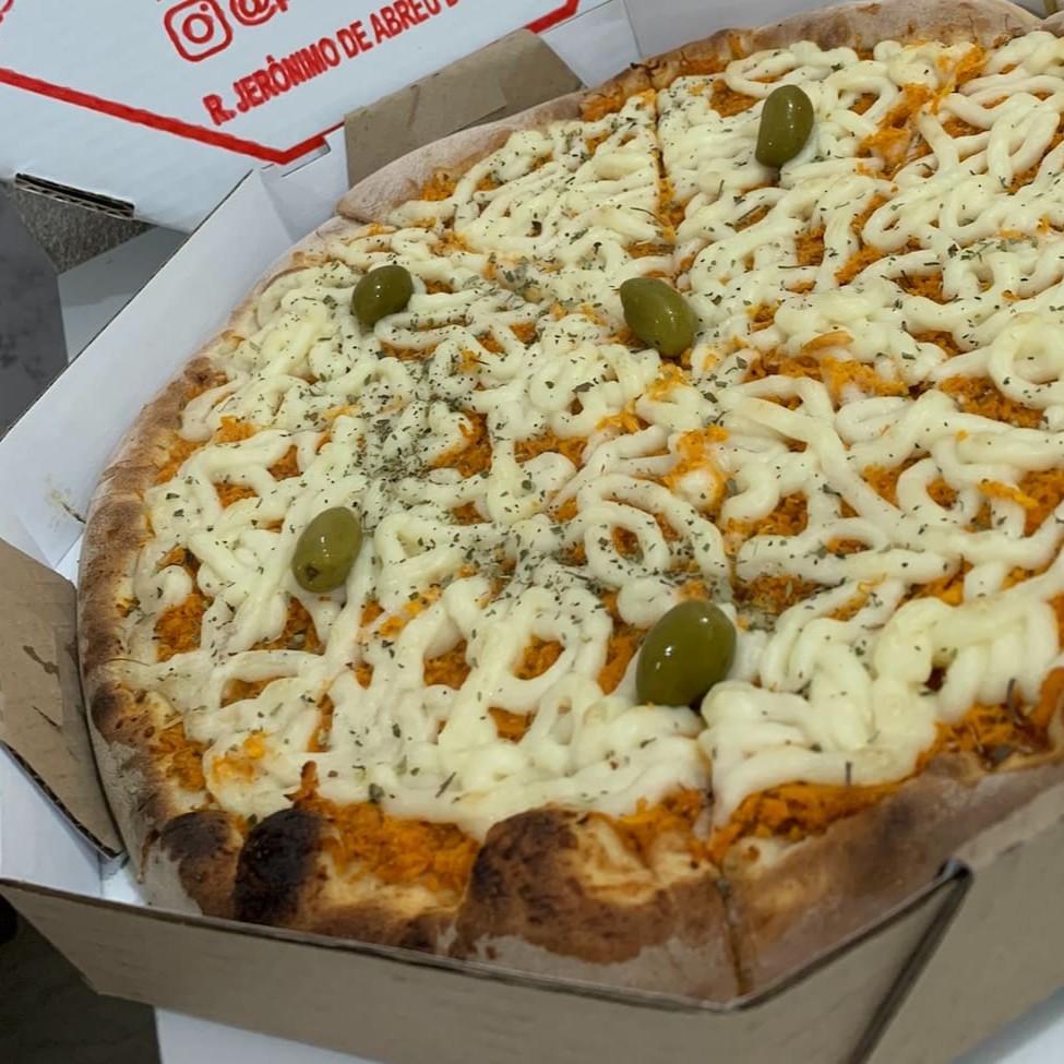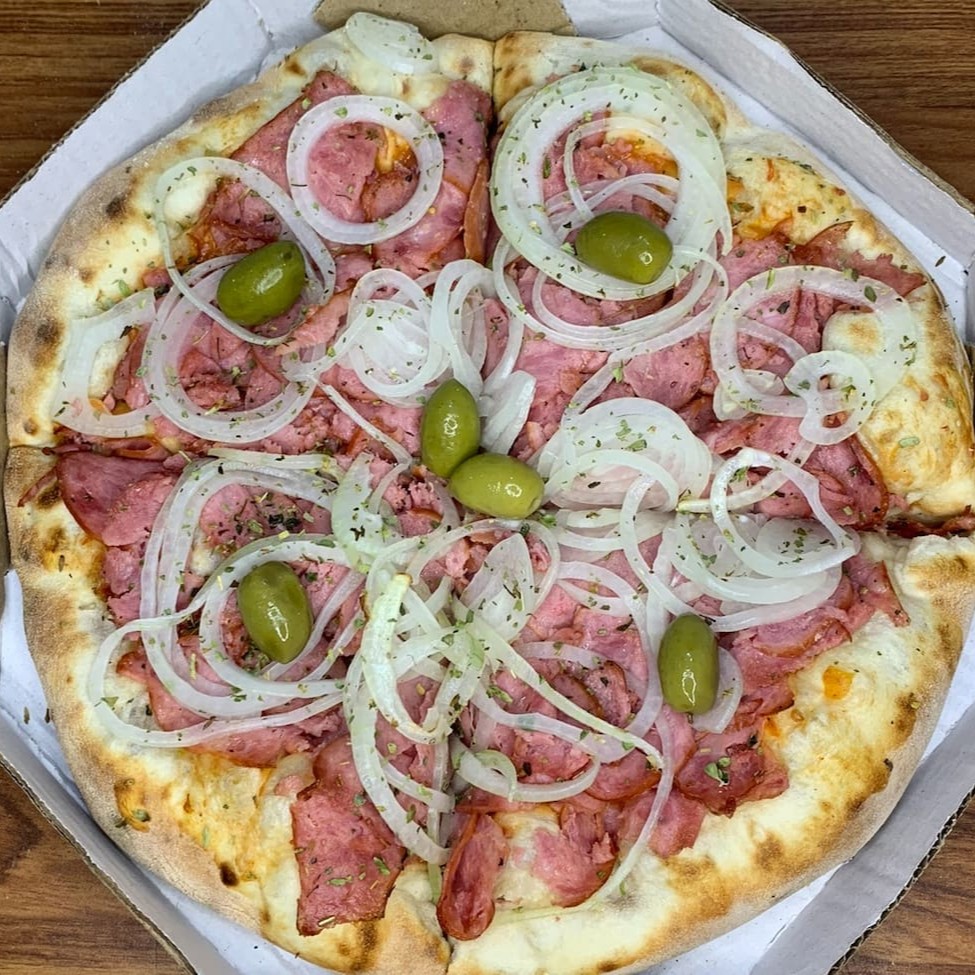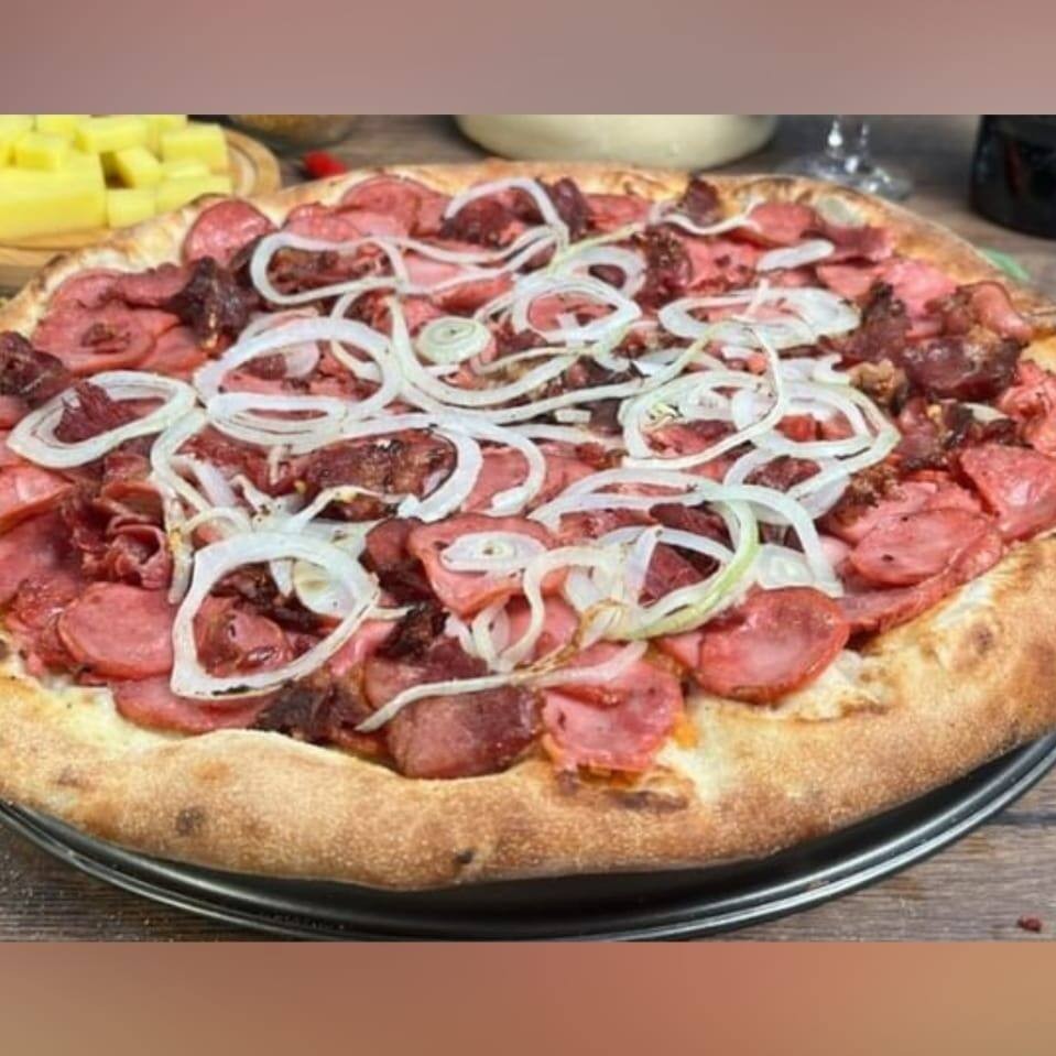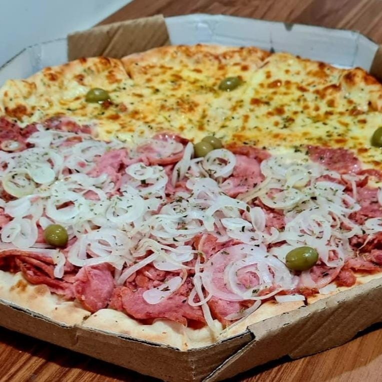 Pizza de 8 fatias. Molho preparado artesanal, sendo uma pizza meio mussarela 3marias e meia calabresa aurora fatiada, coberta com uma camada de cebola sendo finalizada com orégano e azeitona