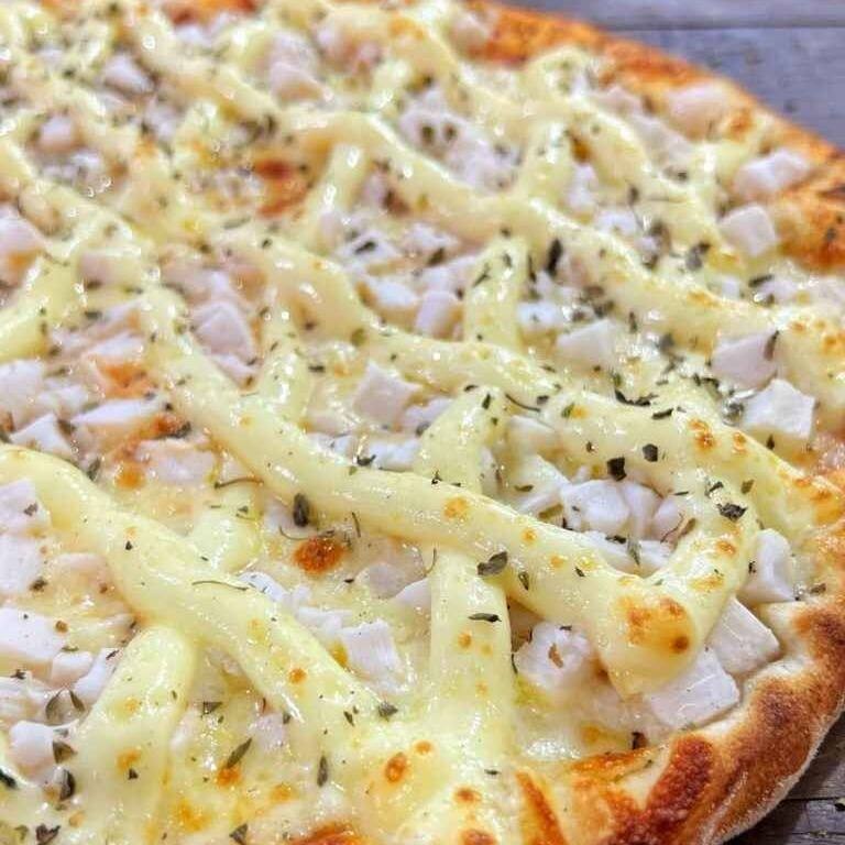 Massa artesanal de fermentação natural , molho de tomate artesanal, frango e Catupiry