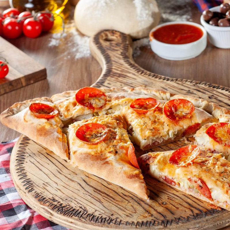 Todos calzones acompanham parmesão e pepperoni por cima da massa.