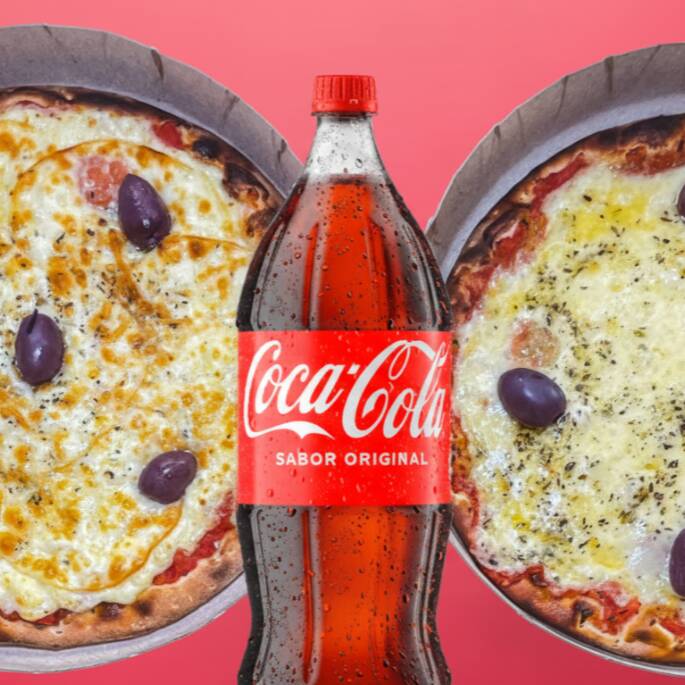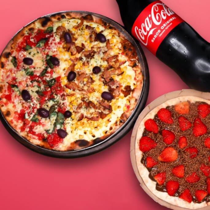 Um combo completo para quem ama equilibrar salgado e doce! Escolha sua pizza grande favorita e finalize com uma irresistível pizza broto de chocolate — cremosa, com sabor marcante de chocolate. Para acompanhar, uma Coca-Cola geladinha que deixa tudo ainda mais gostoso. Perfeito para compartilhar (ou saborear sozinho)!