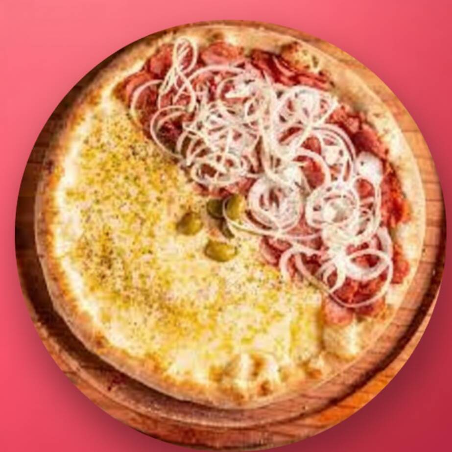 Uma combinação clássica que agrada todos os paladares! Metade com a tradicional calabresa fatiada, levemente dourada e coberta por cebolas finas, e a outra metade com a mussarela derretida e cremosa. Perfeita para quem gosta do equilíbrio entre sabor intenso e suavidade em uma única pizza.