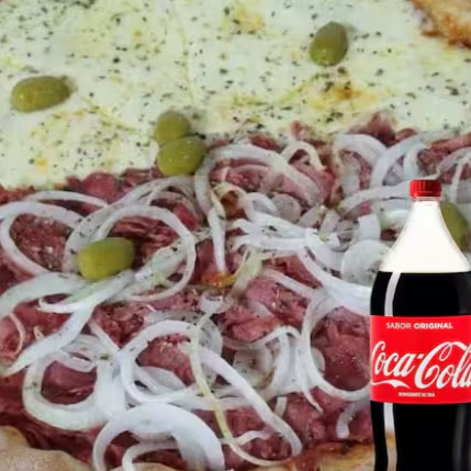 Pizza Grande (8 Fatias) metade Calabresa (Molho de tomate, calabresa, cebola, orégano e azeitonas) e metade Mussarela (Molho de tomate, queijo mussarela, orégano e azeitonas) + 1 Coca Cola 2L