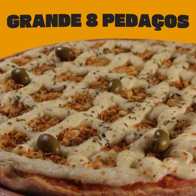 Pizza Grande (8 Fatias) metade Calabresa (Molho de tomate, calabresa, cebola, orégano e azeitonas) e metade Frango com Catupiry (Molho de tomate, frango desfiado, catupiry, orégano e azeitonas)
