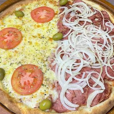 Pizza Grande (8 Fatias) metade de Marguerita (Molho de tomate, mussarela, tomate, manjericão, orégano e azeitonas) e metade Calabresa (Molho de tomate, calabresa, cebola, orégano e azeitonas)