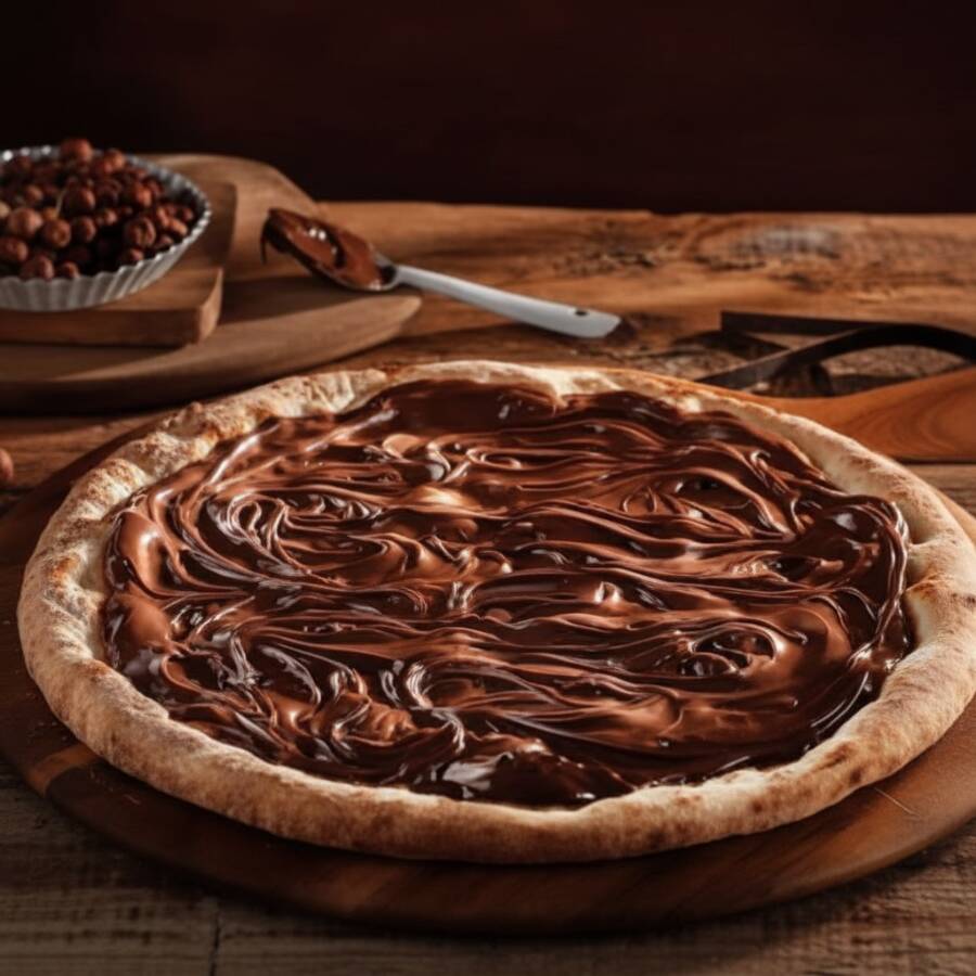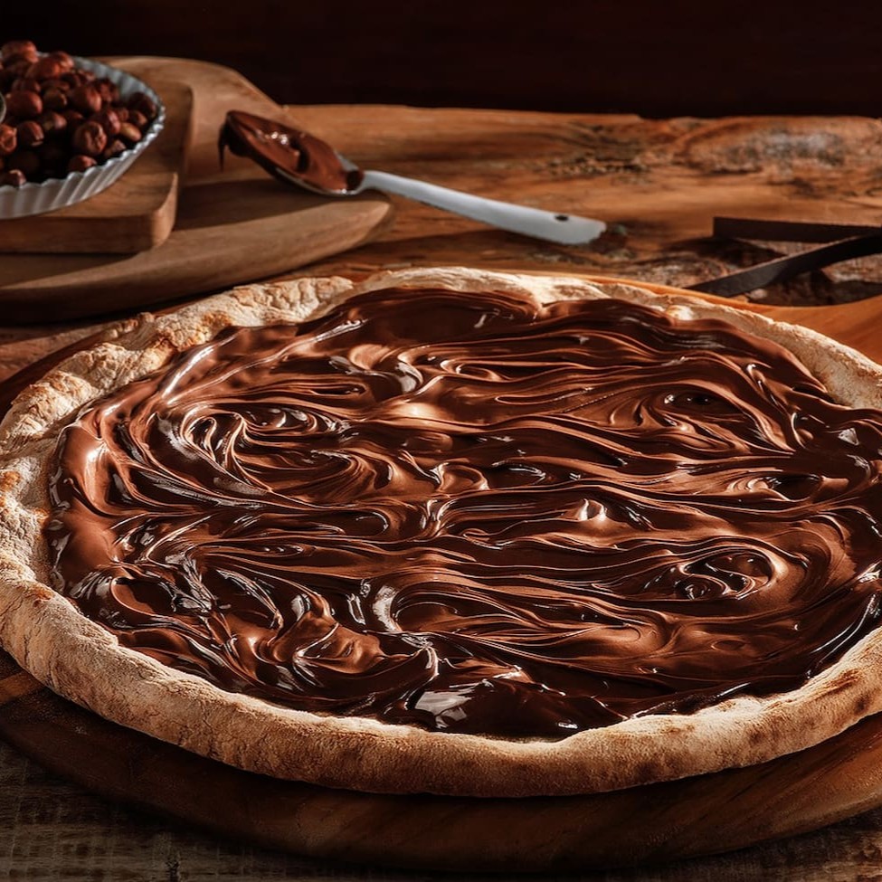 Deliciosa pizza de massa crocante coberta com cremosa Nutella, perfeita para os amantes de doces.