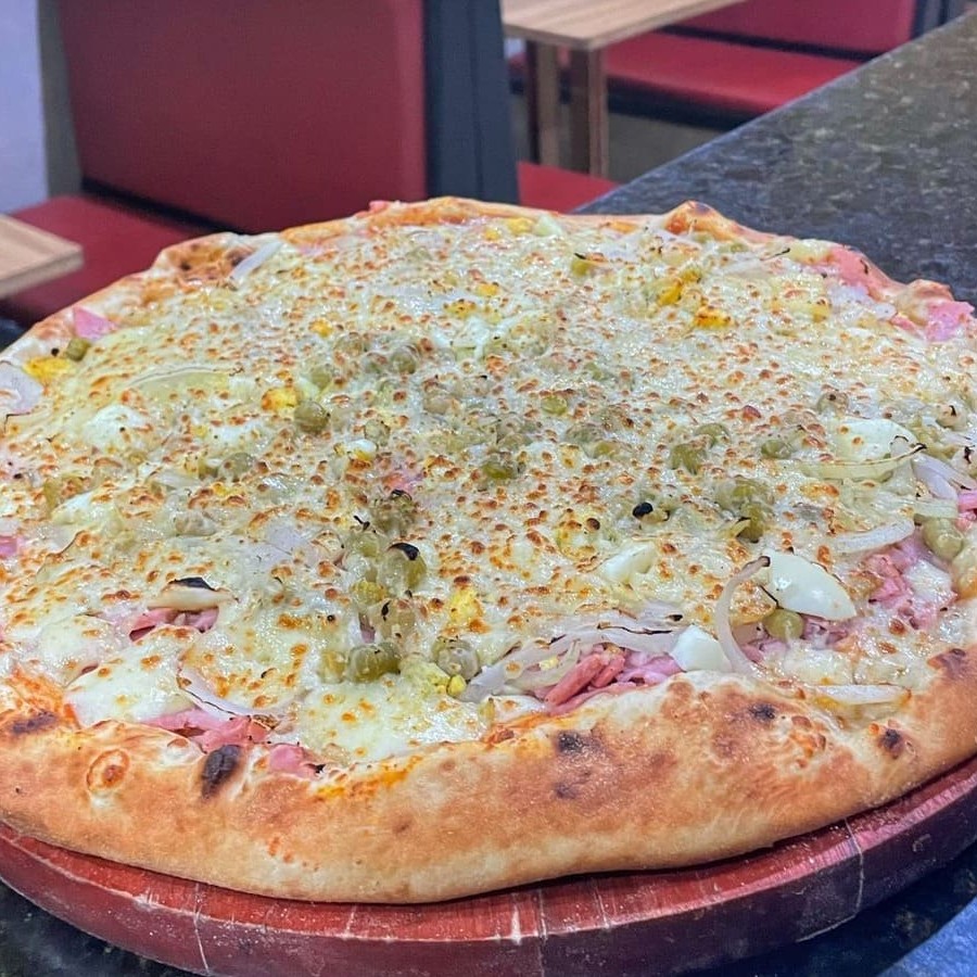 A pizza portuguesa tem uma base crocante coberta com molho de tomate, presunto, ovos, ervilhas, mussarela e cebola, combinando sabores intensos e texturas variadas em cada mordida.