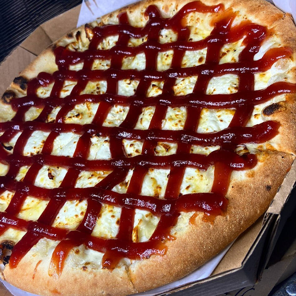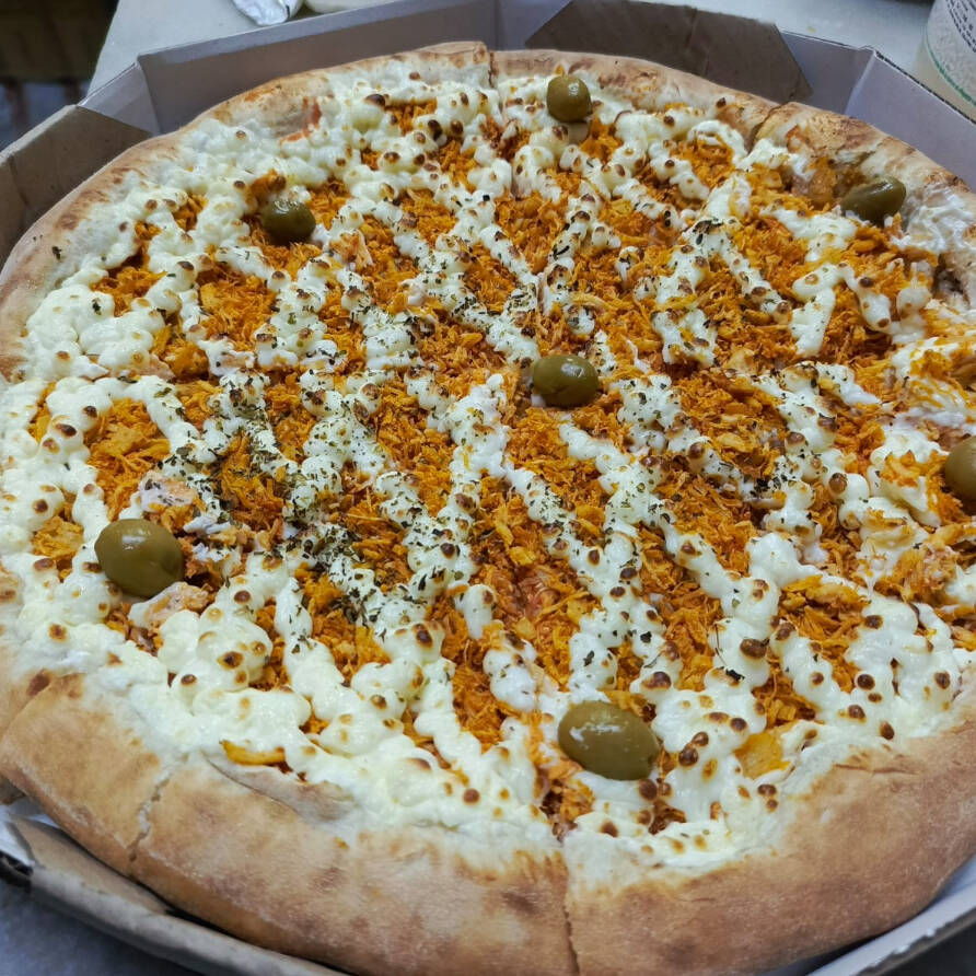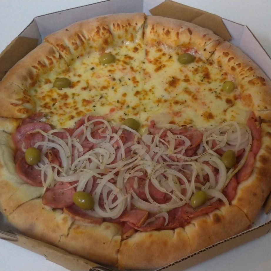 Pizza grande com 8 pedaços, meio a meio, frango com Catupiry e portuquesa, dois sabores tradicionais por um preço promocional.
