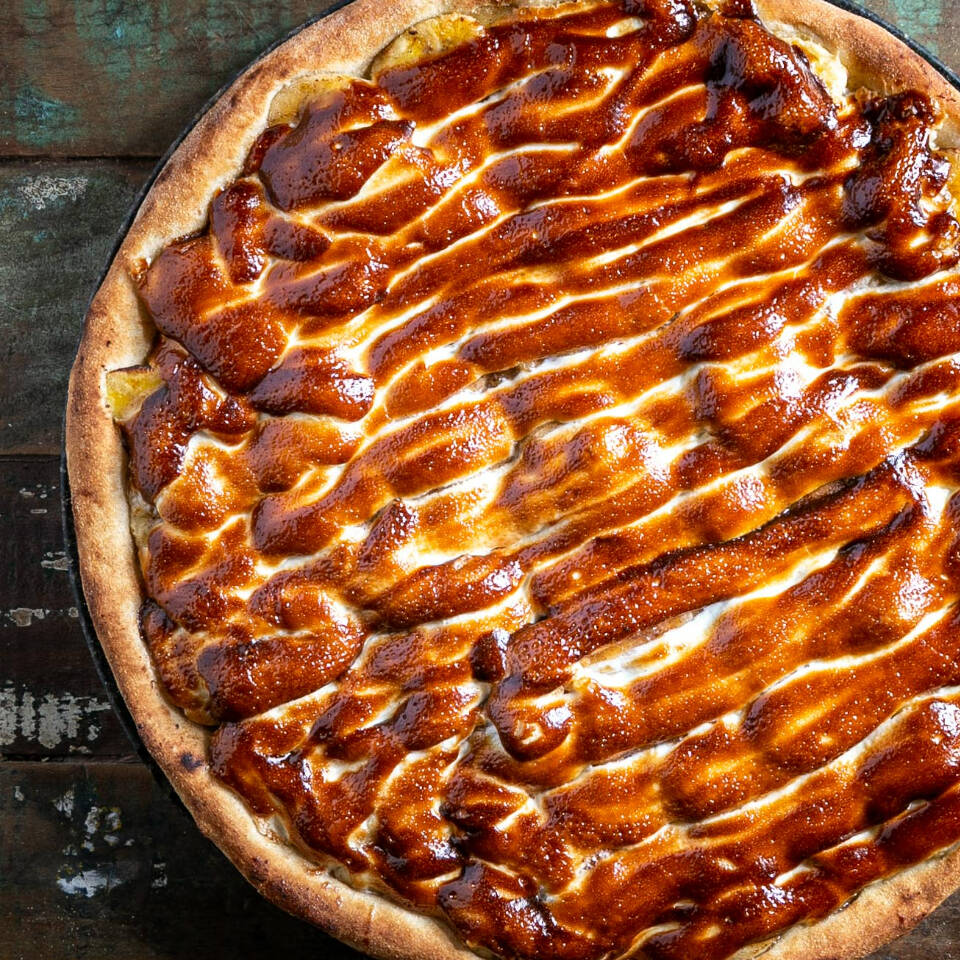 [serve 4 pessoas] Molho de tomate artesanal, carne seca desfiada, Catupiry Original e pimenta biquinho.
