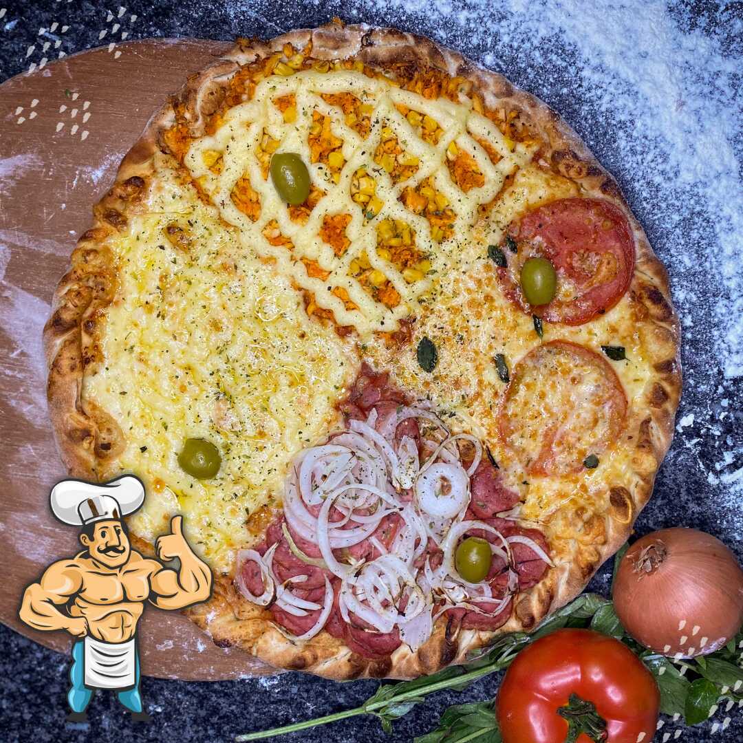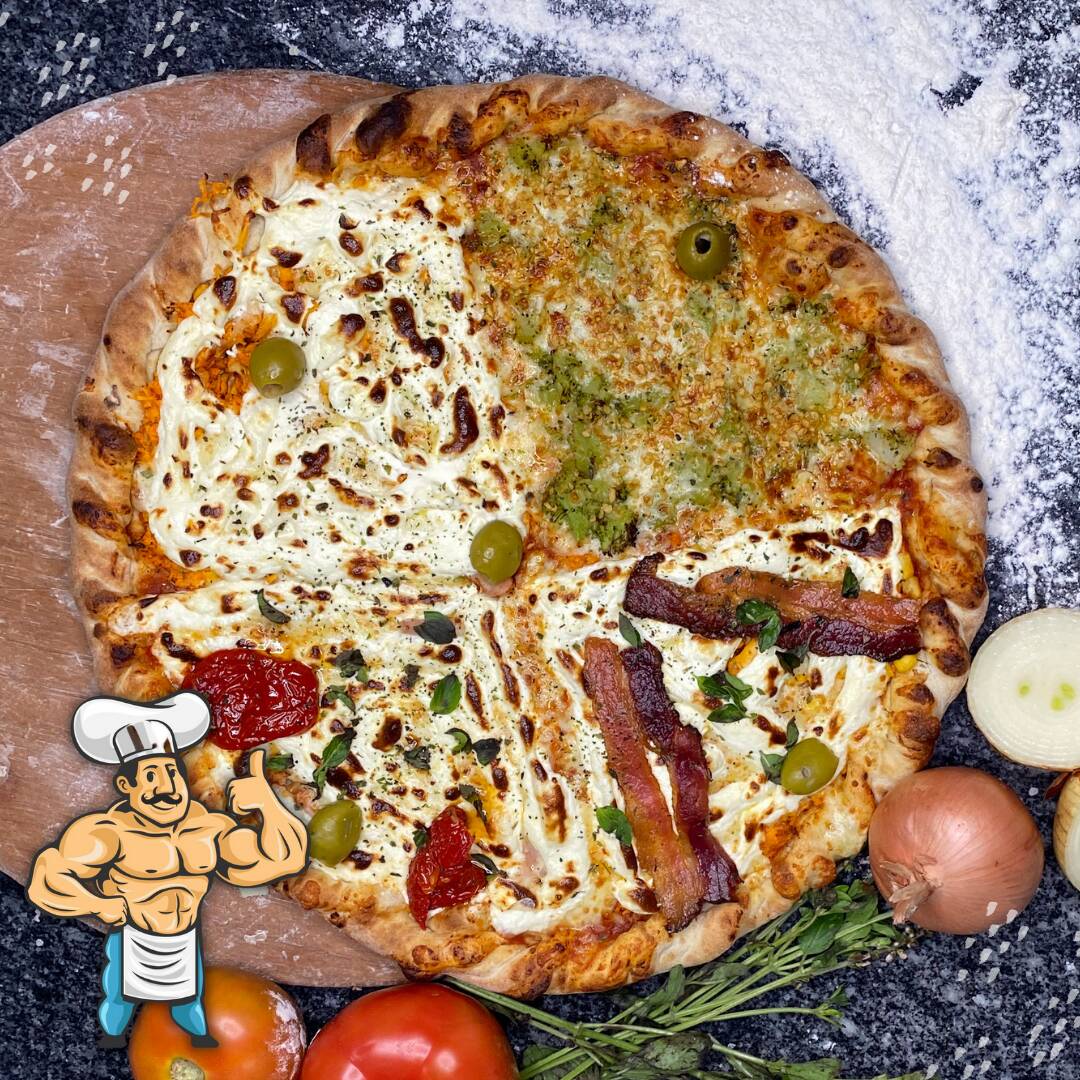 [serve 4 pessoas] Pizza Grande com os 4 sabores Di Monstro mais pedidos: Di Monstro; Da Nutri; Proteína Pura; Do Hulk.
