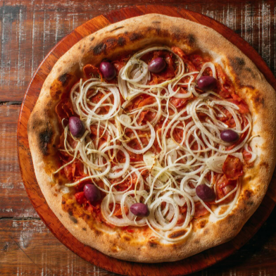 [serve 4 pessoas] Molho de tomate, calabresa fatiada e cebola, finalizada com orégano e azeitona sem caroço.