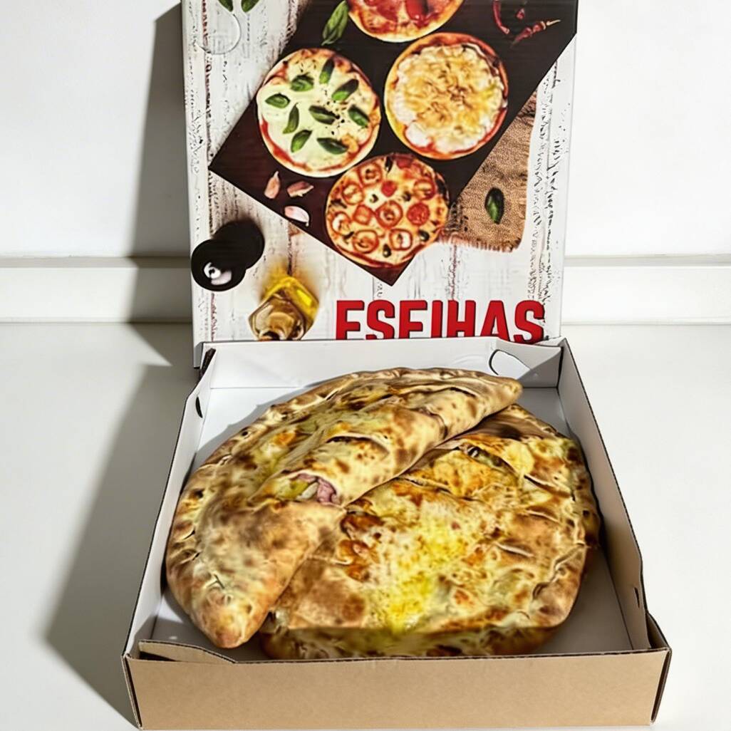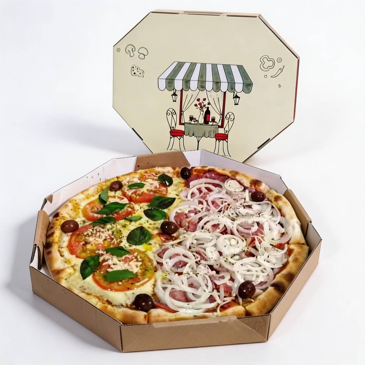 A pizza de 8 pedaços "Calamussa" combina a intensidade da calabresa com a suavidade da mussarela, proporcionando uma experiência de sabor clássica e deliciosa.