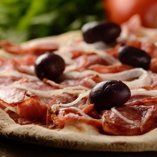 Deliciosa pizza com fatias de calabresa, cebola e azeitona.