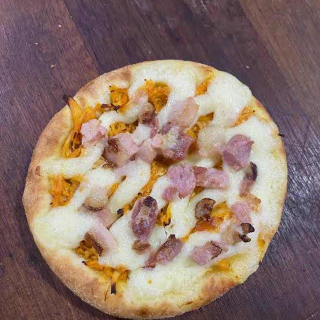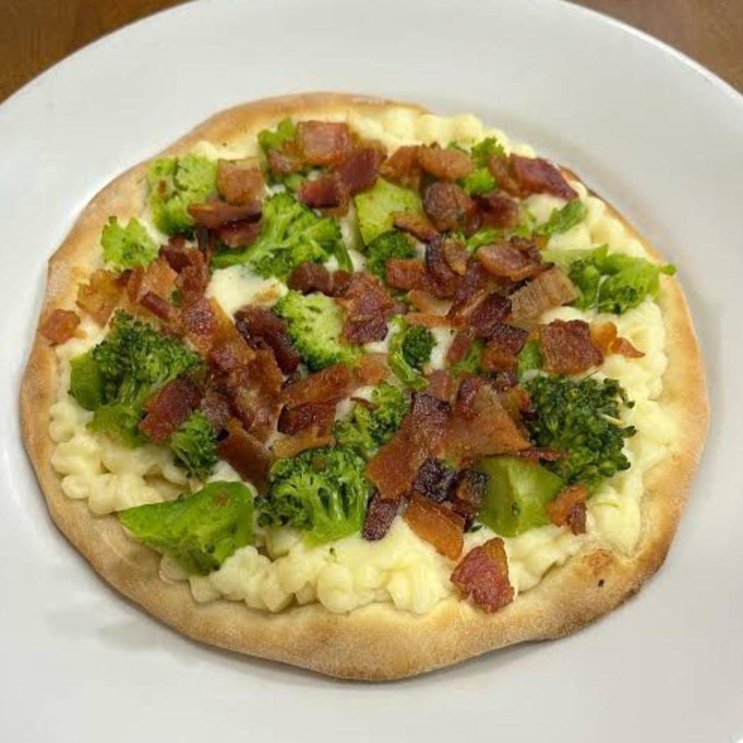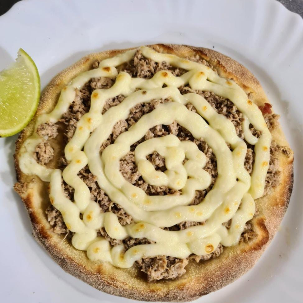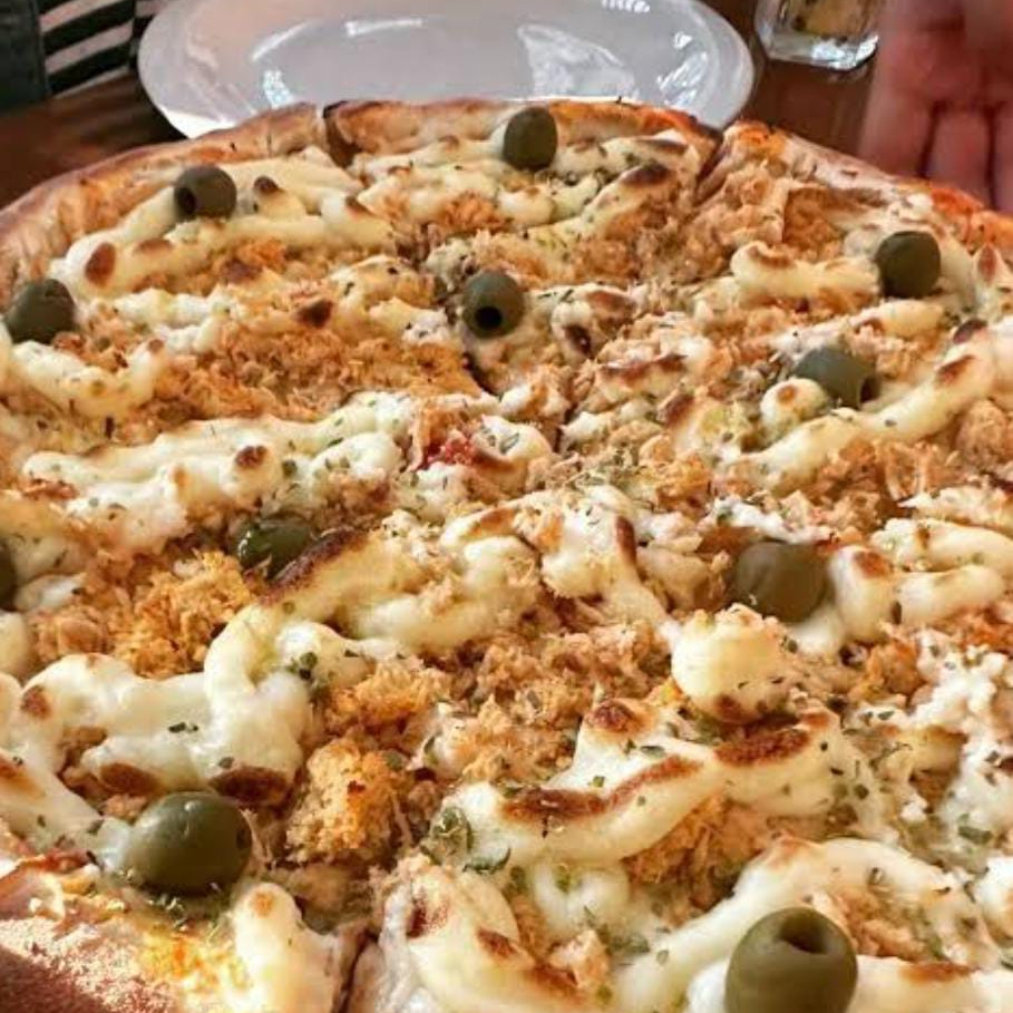 Atum, brocolis, cebola, catupiry, mussarela e bacon.